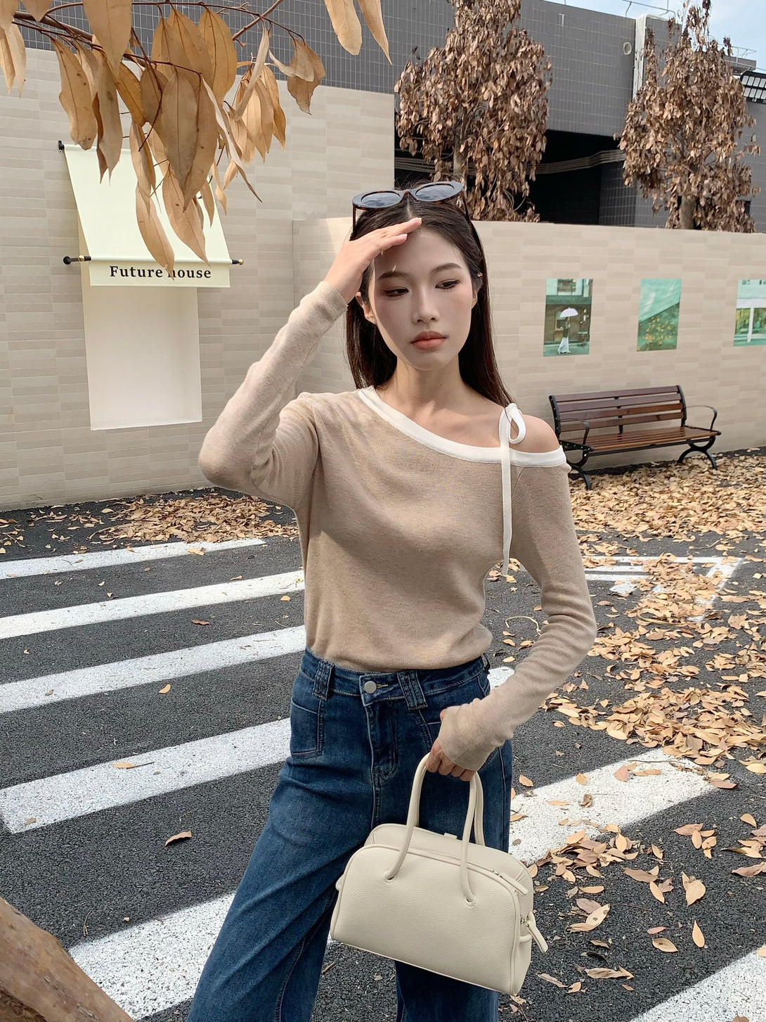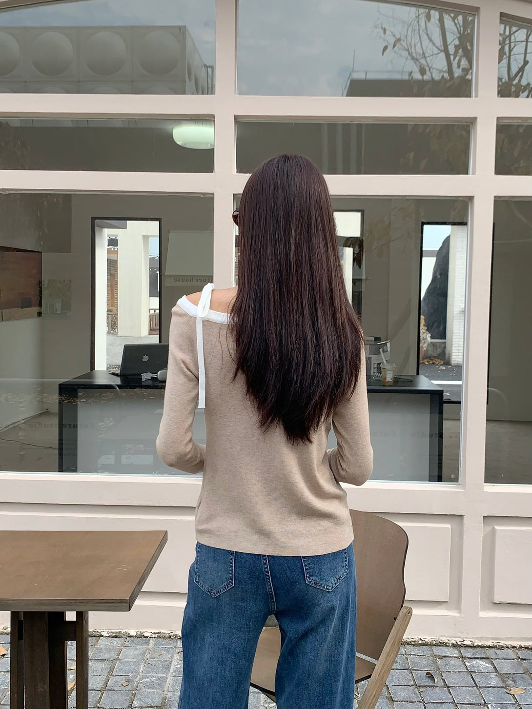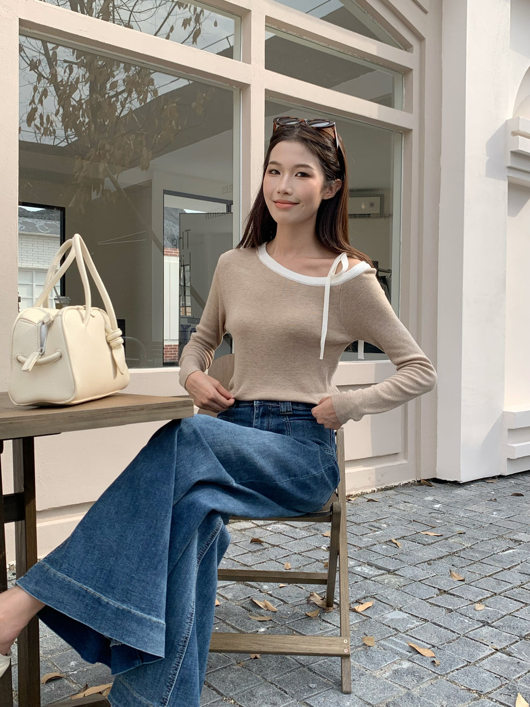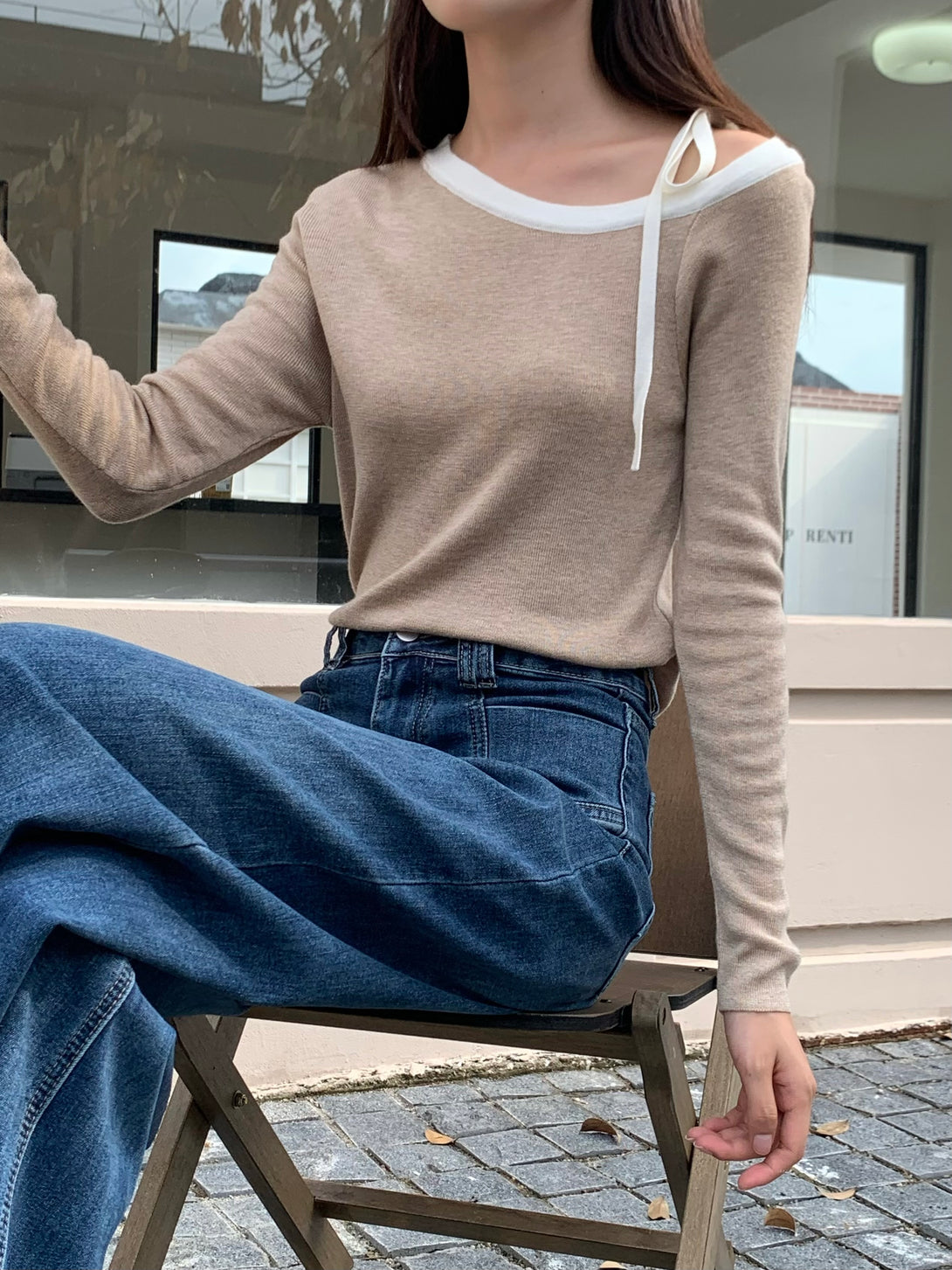 This top feels gentle yet subtly playful — the beige tone is clean and soft, while the white tie detail on the shoulder adds a touch of charm. The lightweight knit fabric drapes naturally, giving off an effortless elegance. Paired with jeans, it creates a laid-back yet refined everyday look.