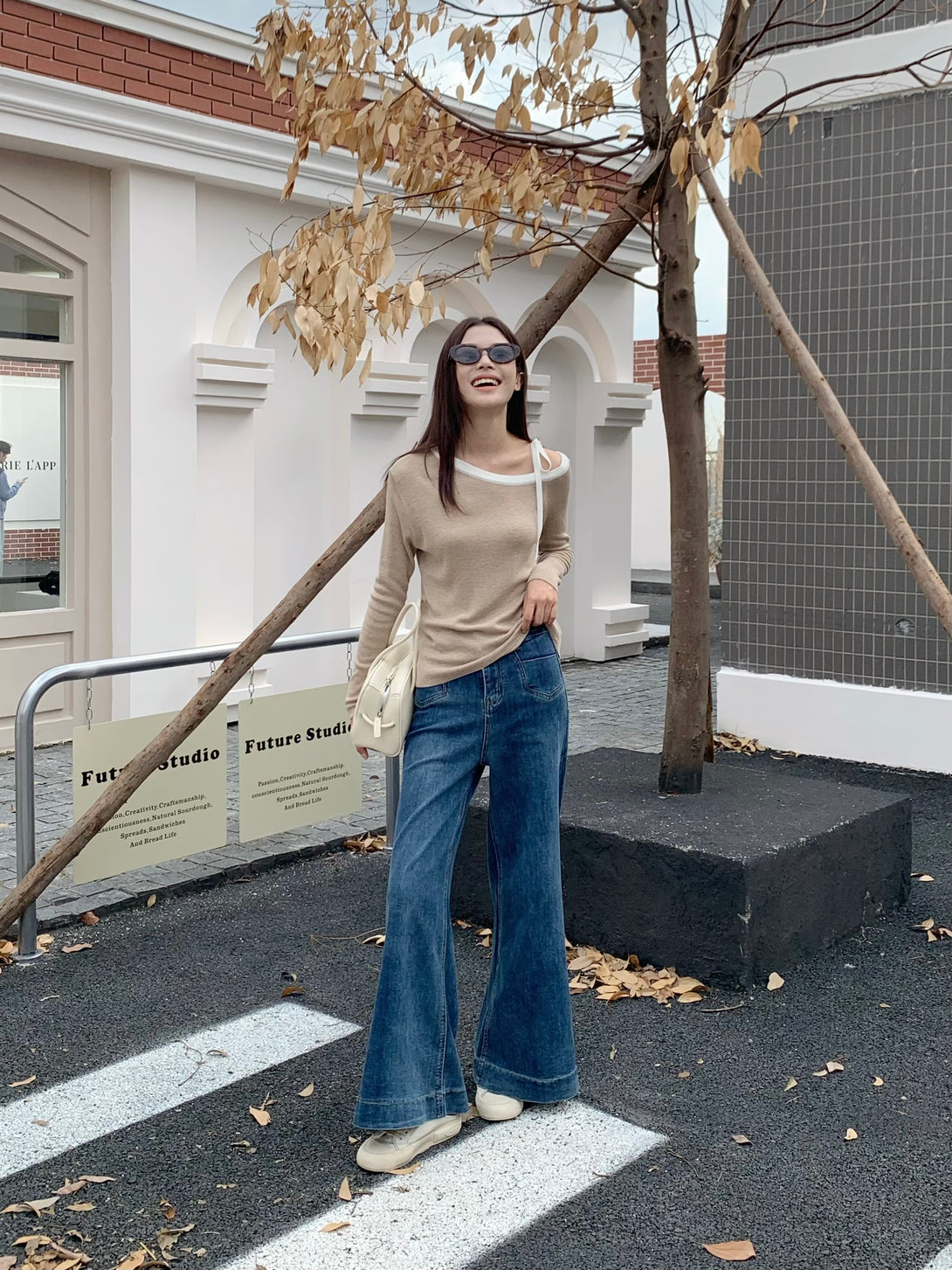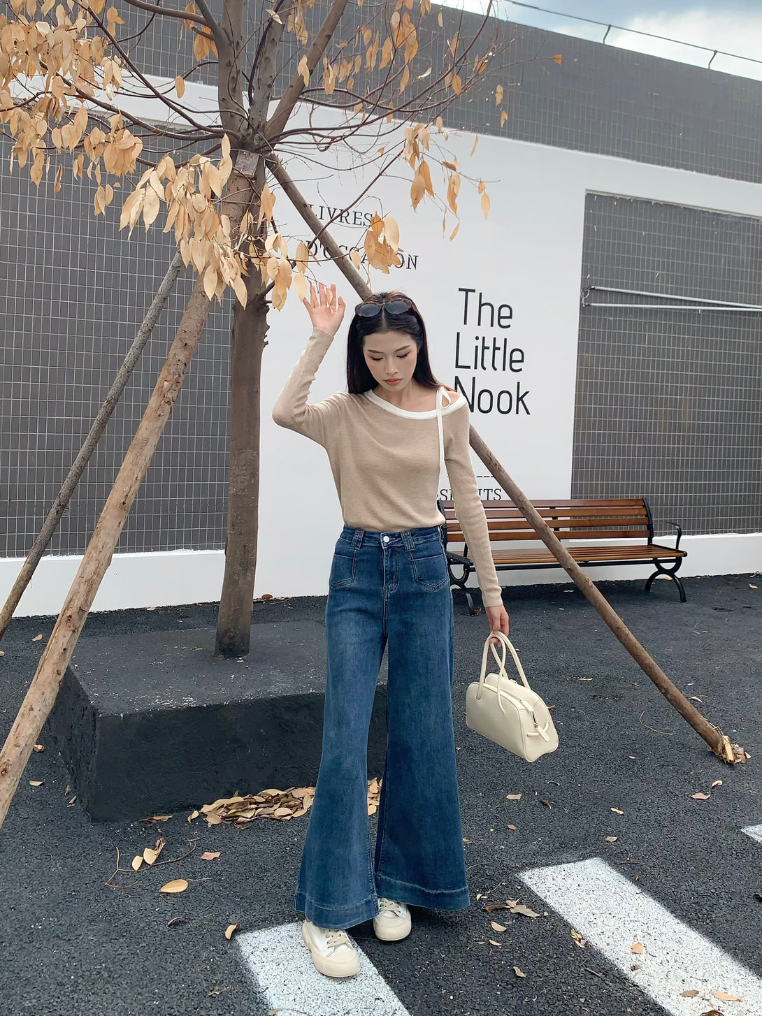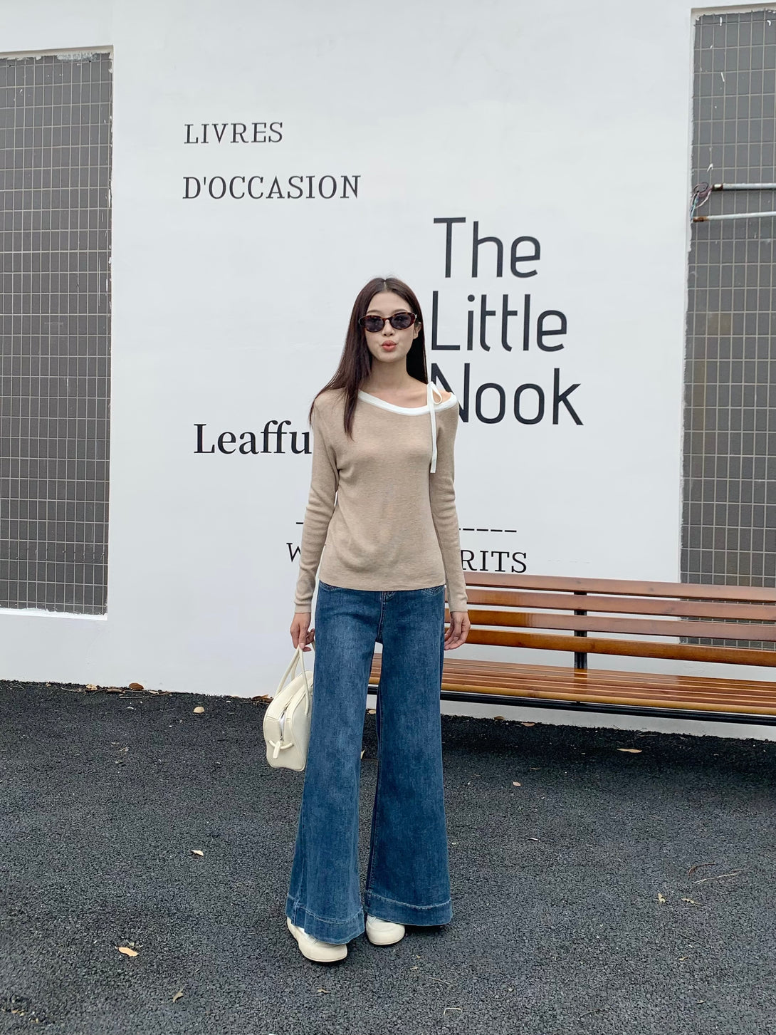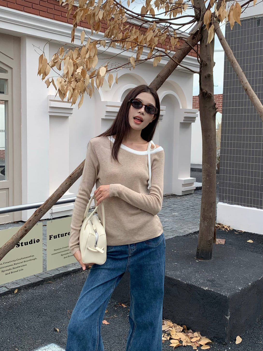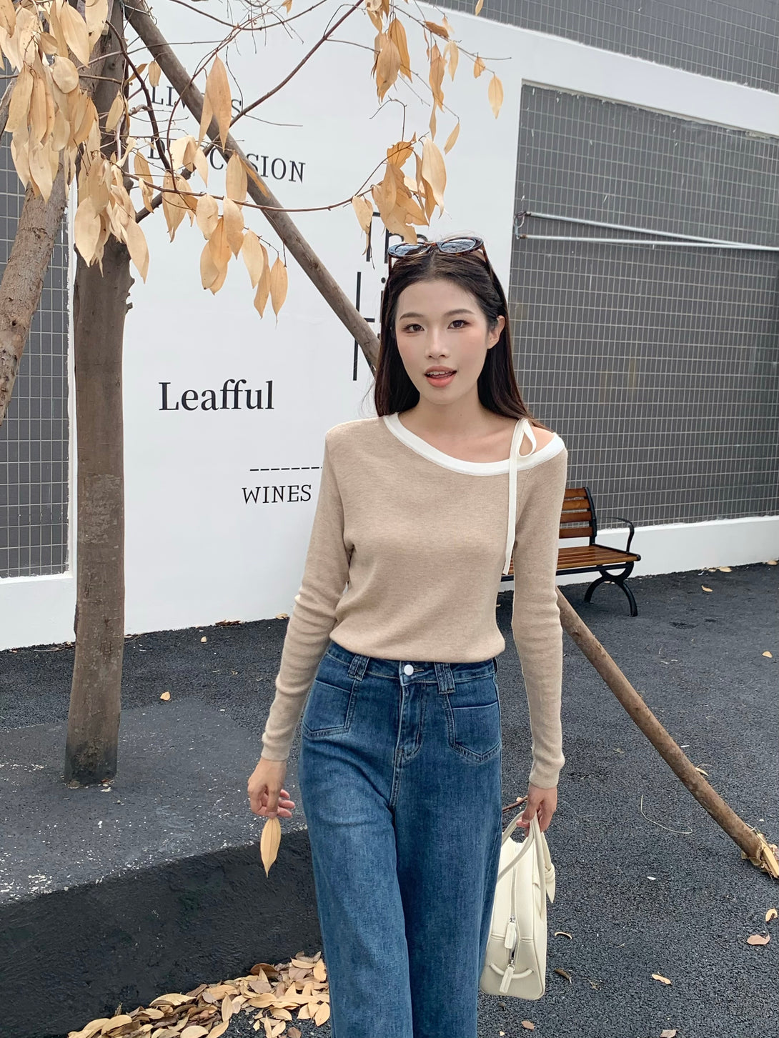 This top feels gentle yet subtly playful — the beige tone is clean and soft, while the white tie detail on the shoulder adds a touch of charm. The lightweight knit fabric drapes naturally, giving off an effortless elegance. Paired with jeans, it creates a laid-back yet refined everyday look.