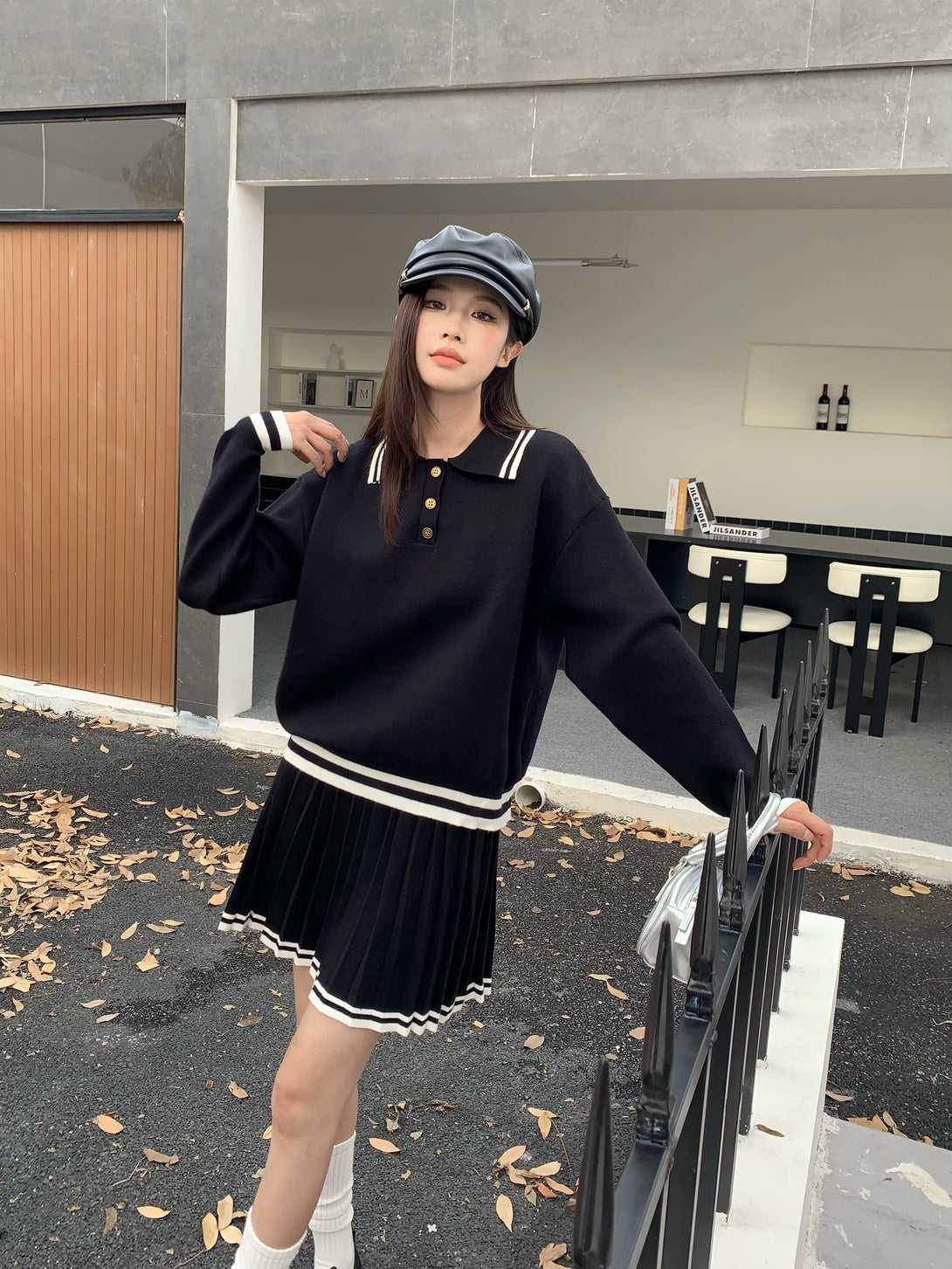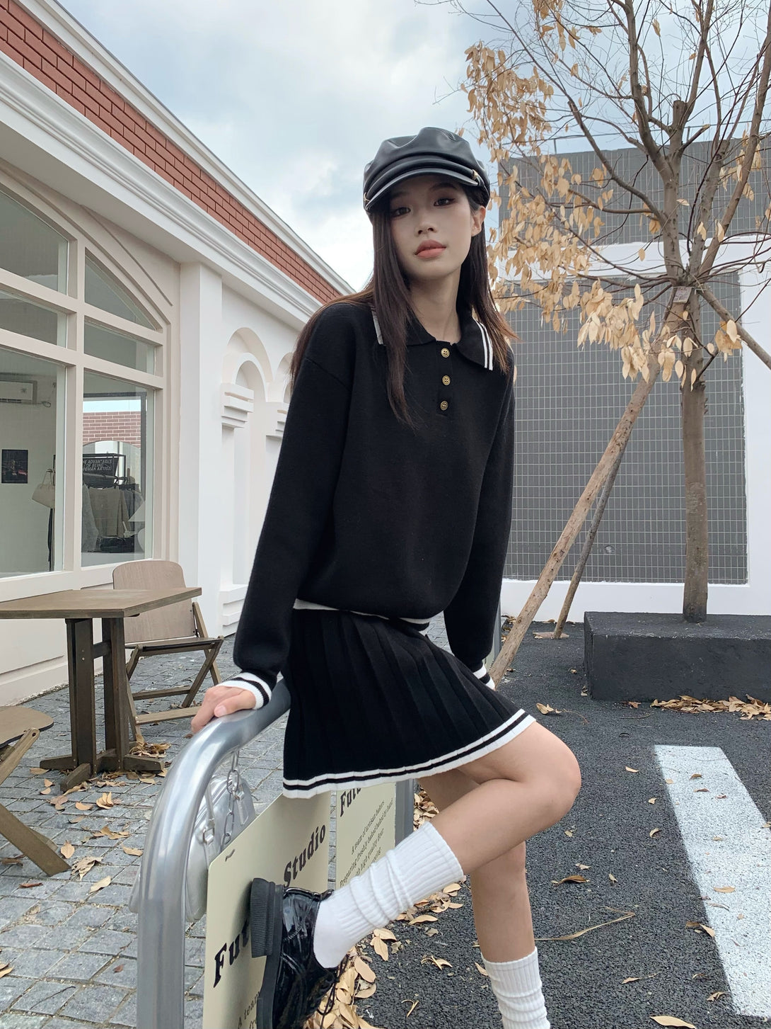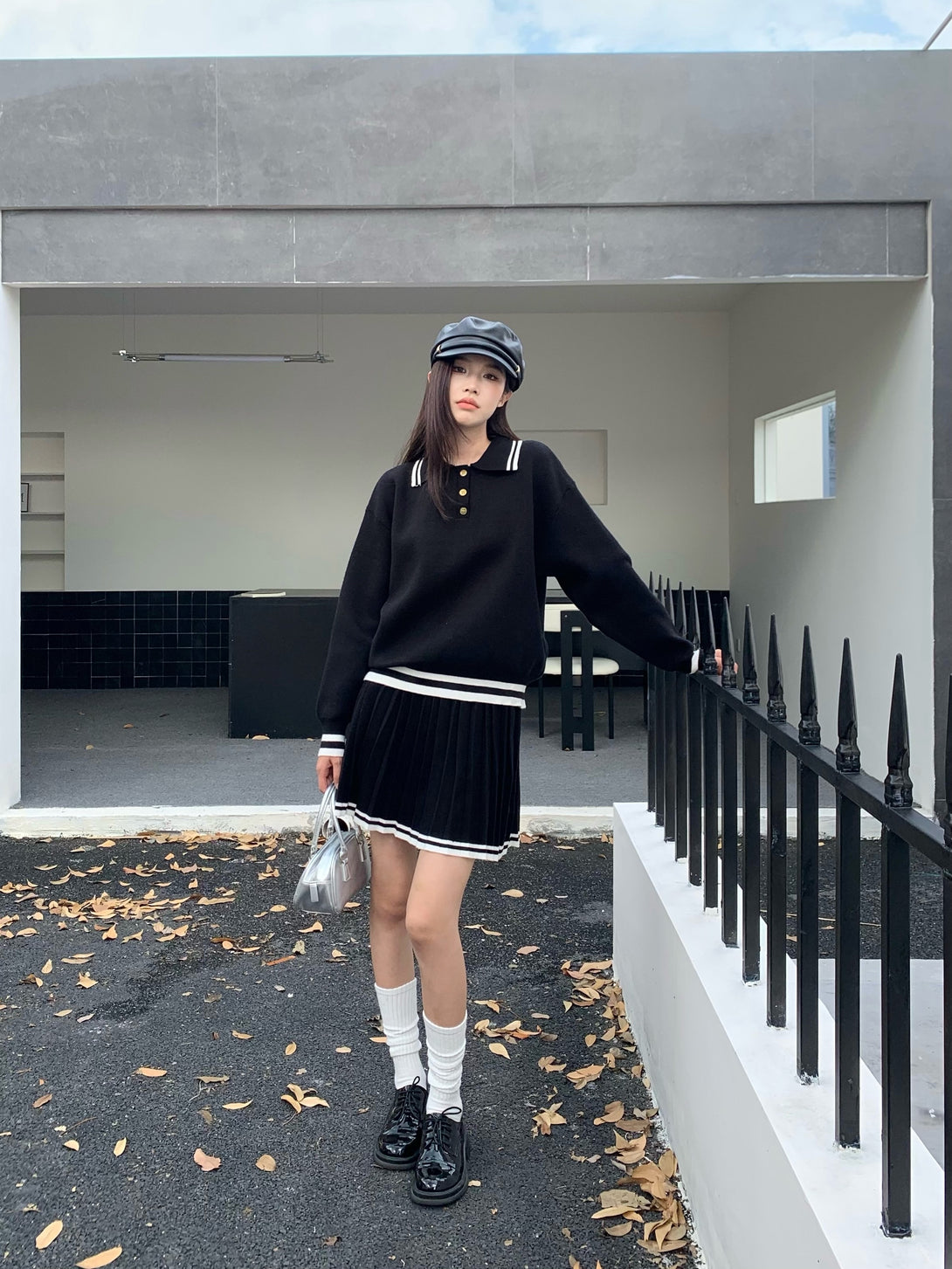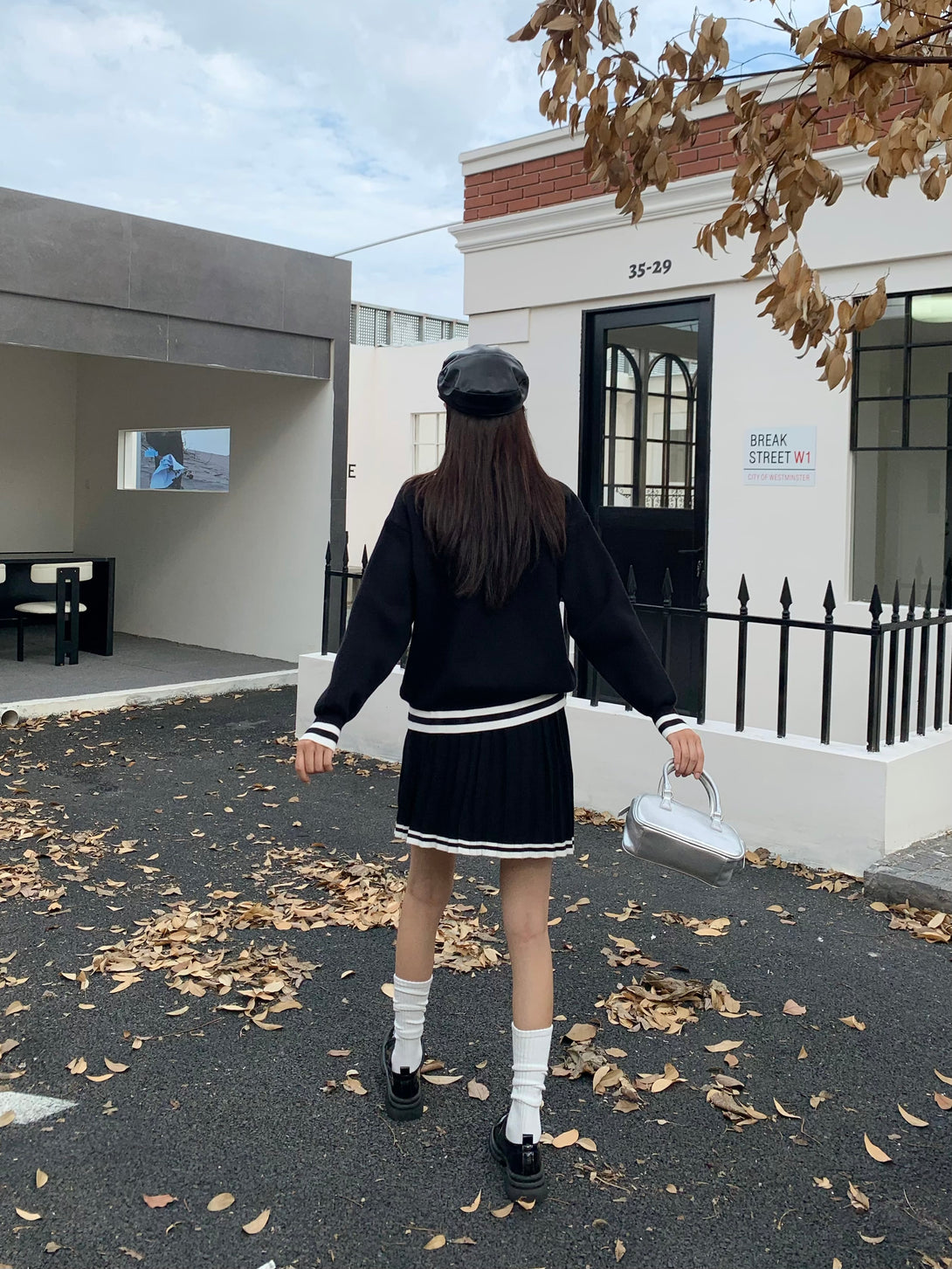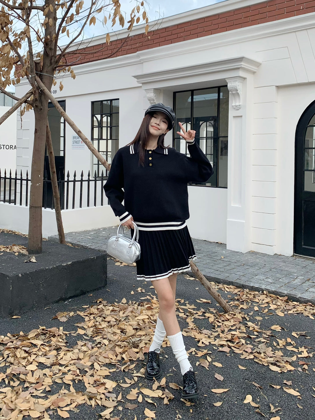This black knit set carries a touch of school-girl charm, with a loose top paired with a pleated skirt, casual yet playful. The white stripes on the collar and hem add a refreshing and lively detail. The look is simple and chic, while still keeping a girlish cuteness. Perfect for everyday outings or campus style, it easily shows a sweet vibe.
