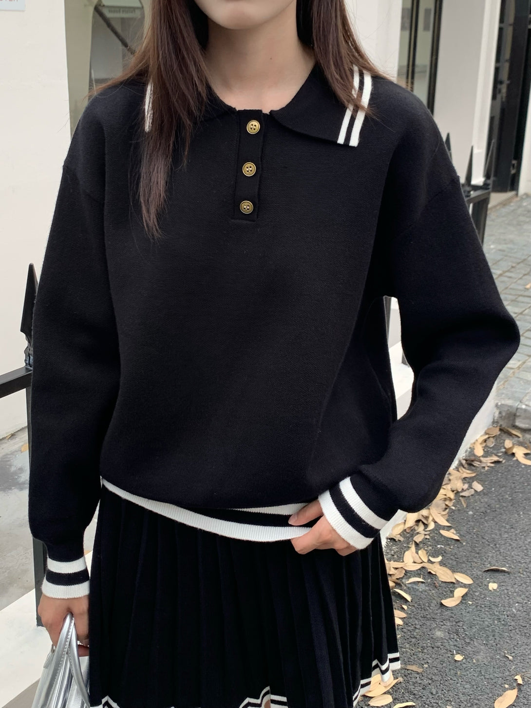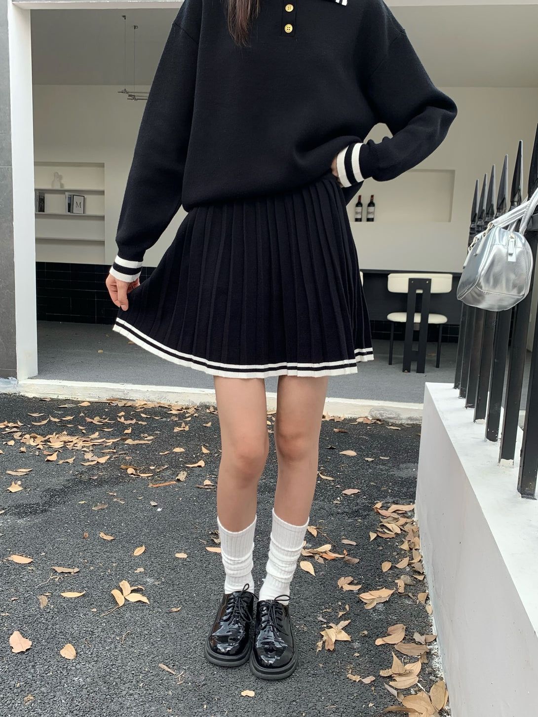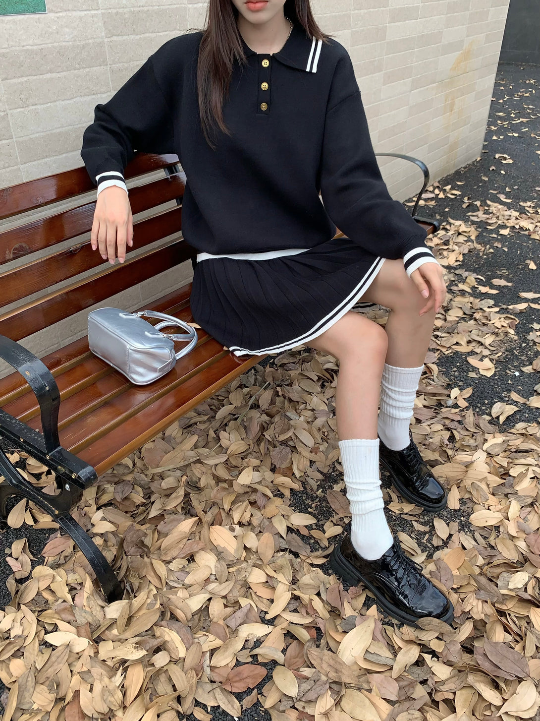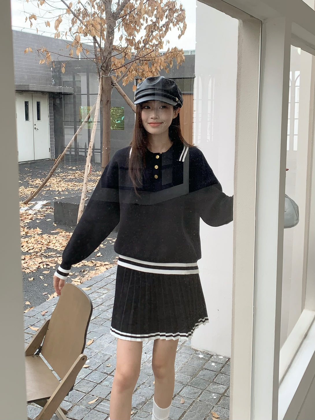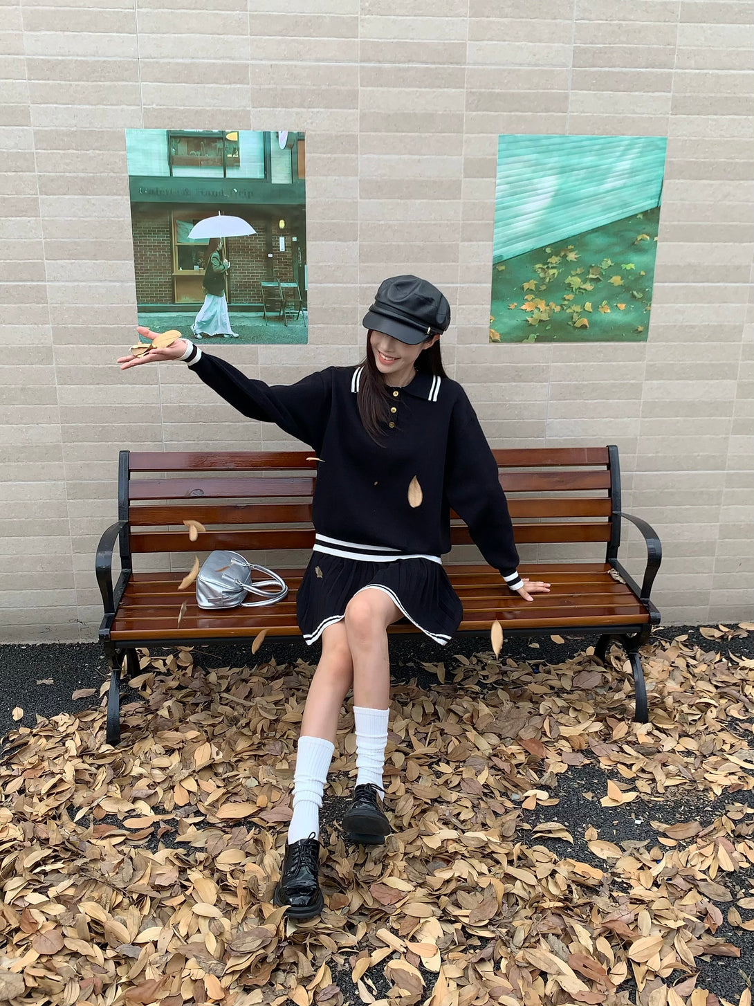 This black knit set carries a touch of school-girl charm, with a loose top paired with a pleated skirt, casual yet playful. The white stripes on the collar and hem add a refreshing and lively detail. The look is simple and chic, while still keeping a girlish cuteness. Perfect for everyday outings or campus style, it easily shows a sweet vibe.