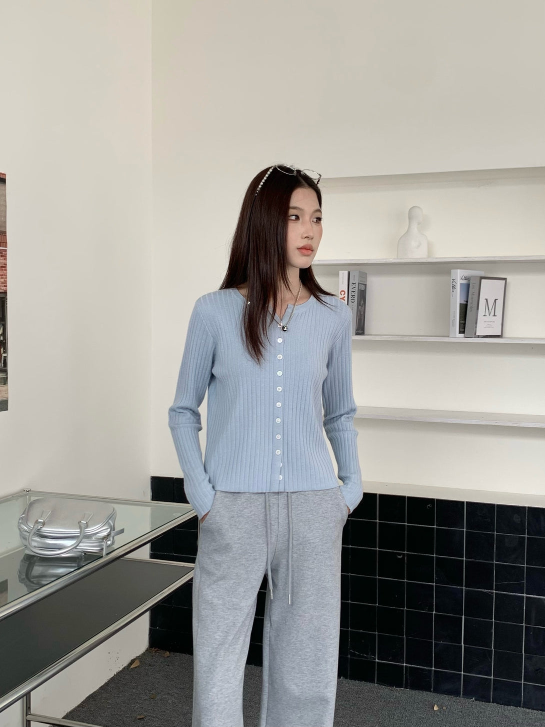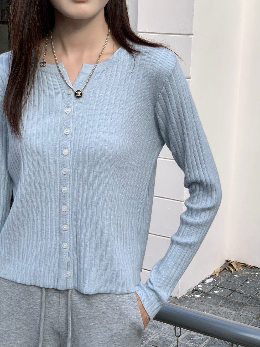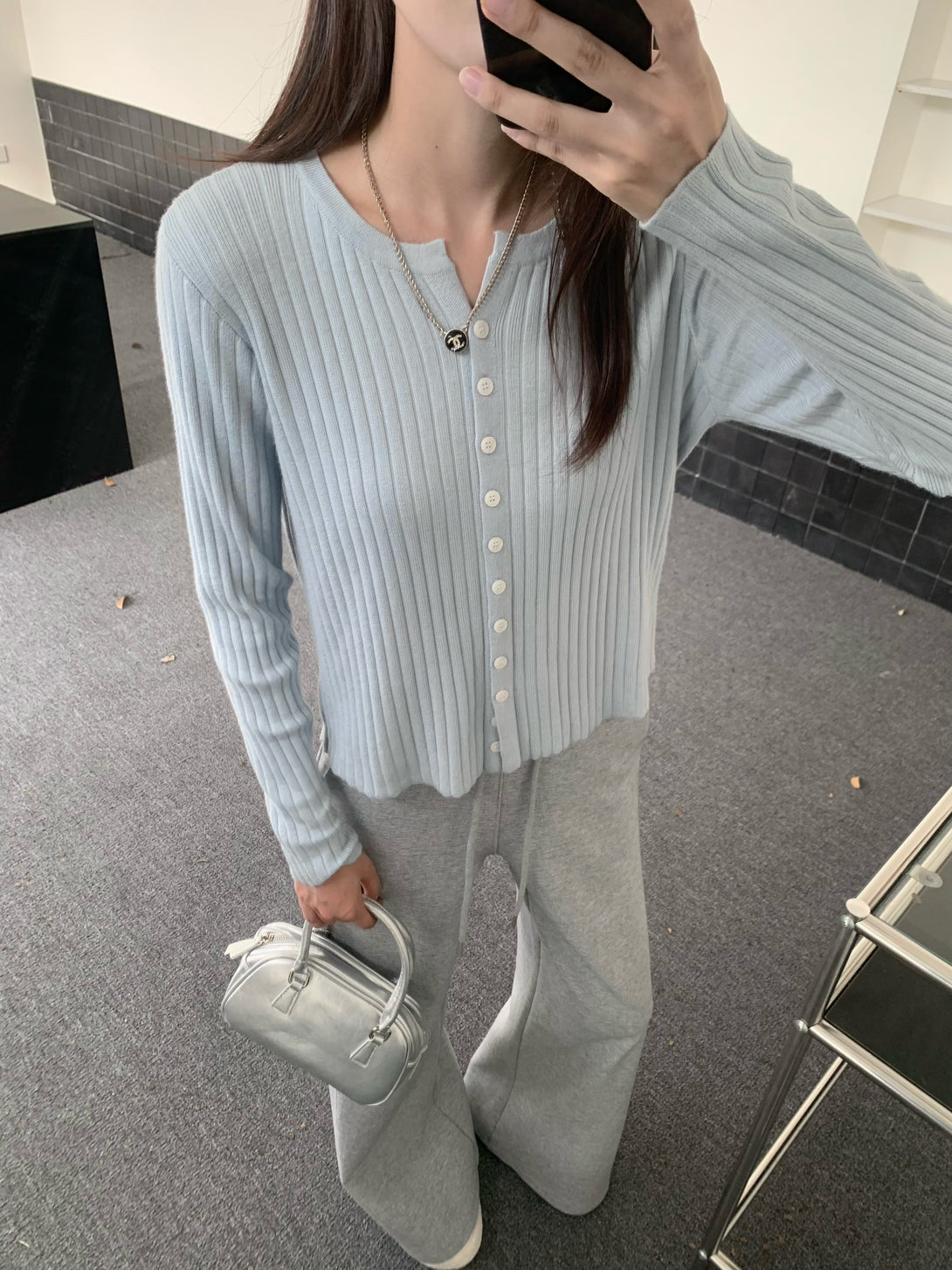 This light blue knit cardigan carries a soft, gentle vibe. The fine ribbed texture flatters the silhouette, giving a clean and graceful look. With a simple round neckline and a row of buttons, the design feels effortlessly refined, while the wavy hem adds a touch of lightness. Wearing it feels like being wrapped in a soft cloud — cozy and serene.