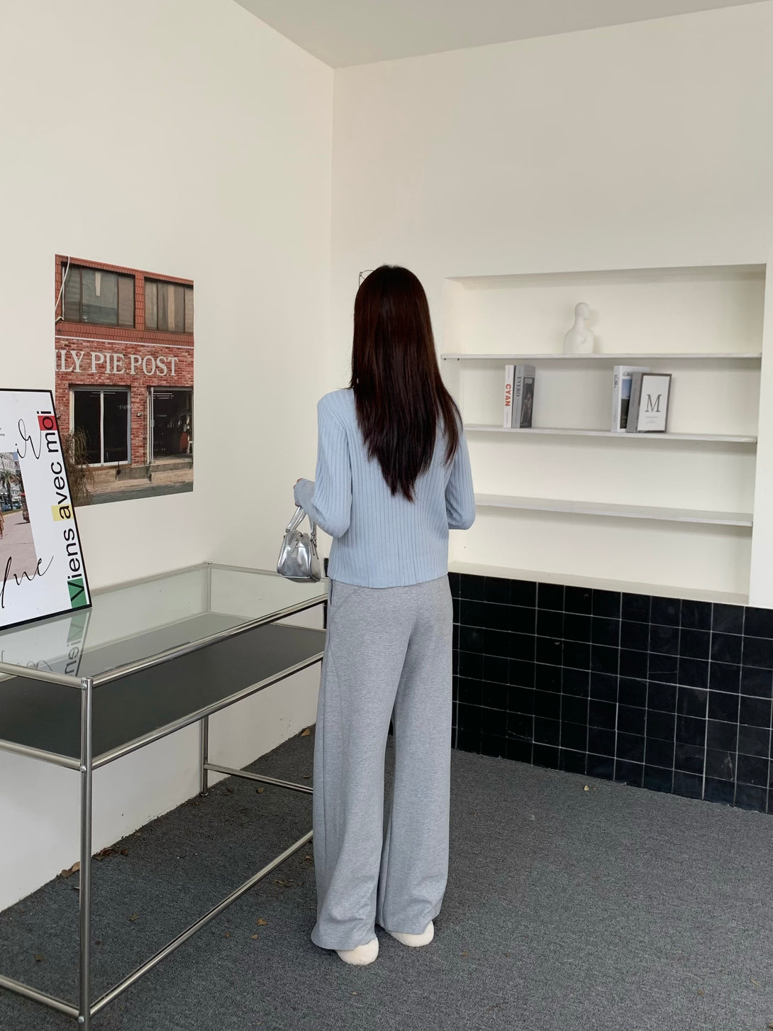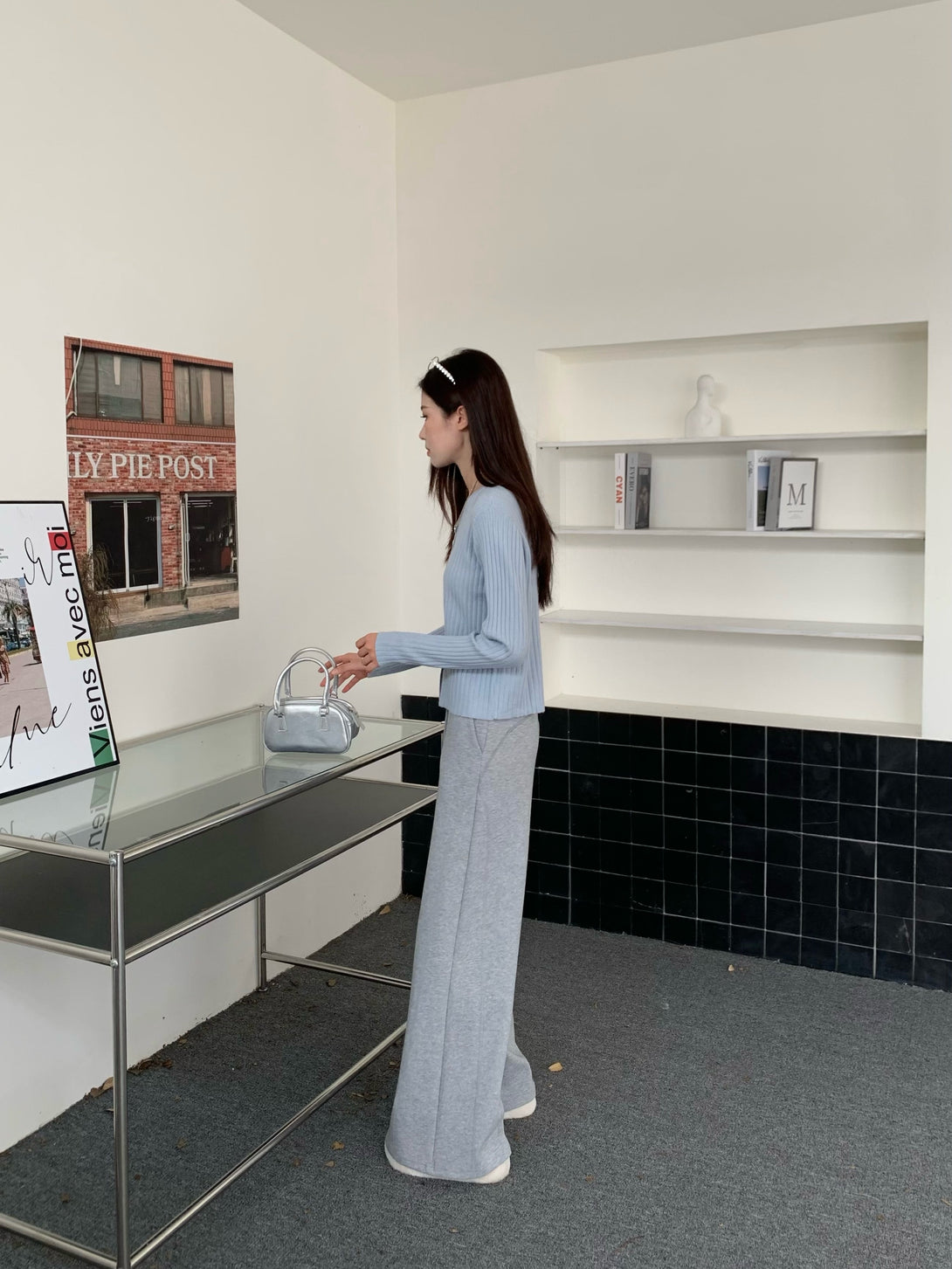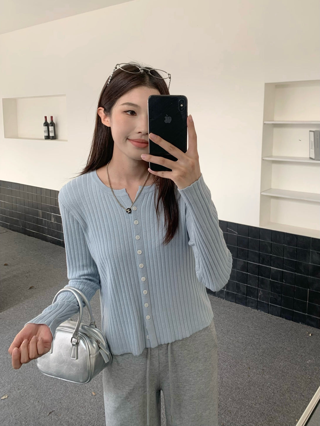 This light blue knit cardigan carries a soft, gentle vibe. The fine ribbed texture flatters the silhouette, giving a clean and graceful look. With a simple round neckline and a row of buttons, the design feels effortlessly refined, while the wavy hem adds a touch of lightness. Wearing it feels like being wrapped in a soft cloud — cozy and serene.
