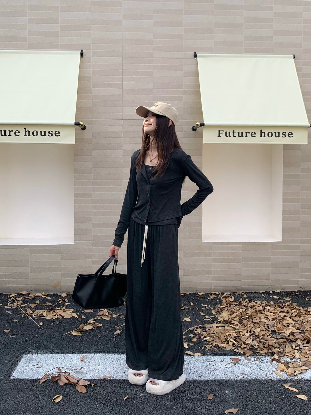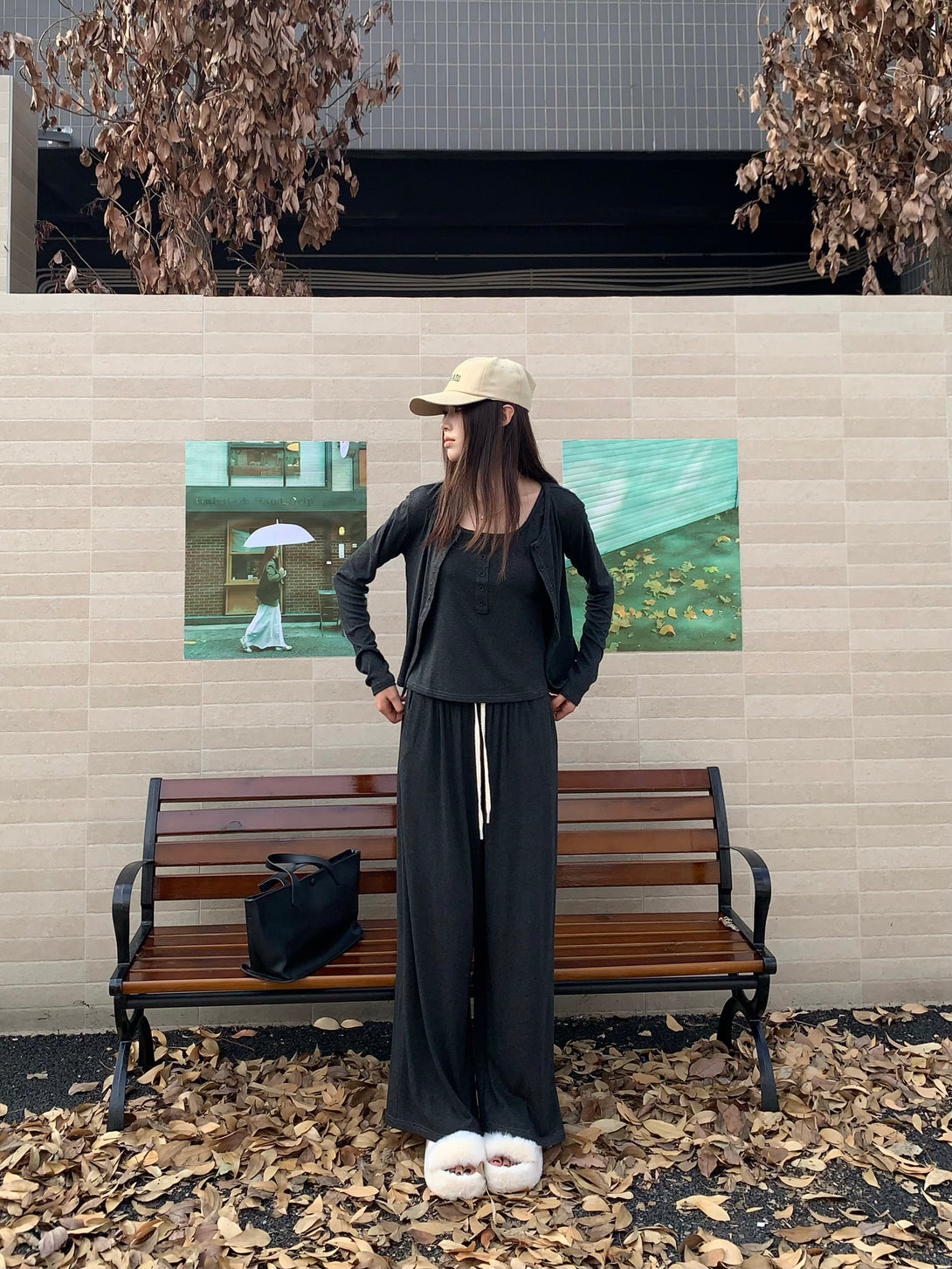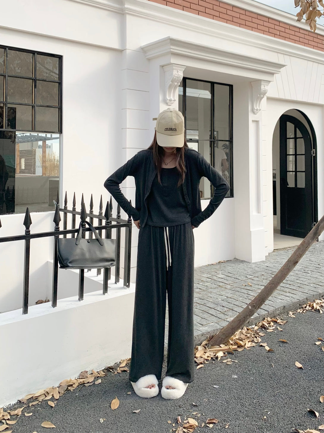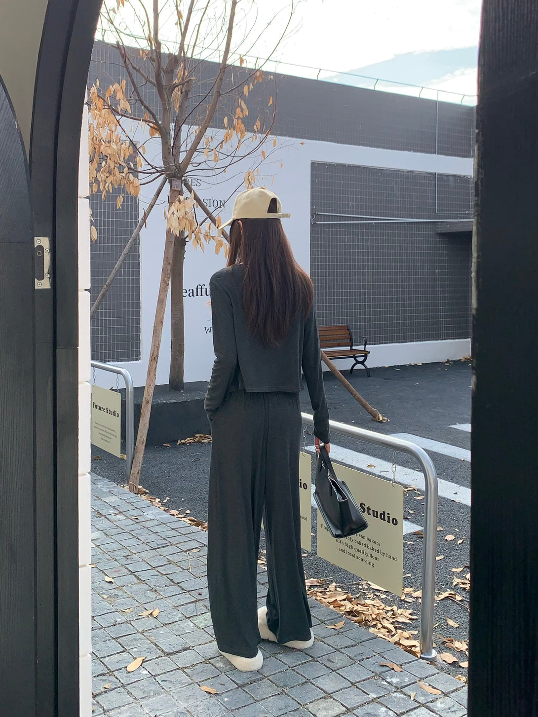 这套深灰色套装真的太省心啦!随便一穿就很好看,软软的面料穿起来超舒服,休闲阔腿裤的走起路来还有风~最喜欢这种不费力又有点小帅气的感觉了!