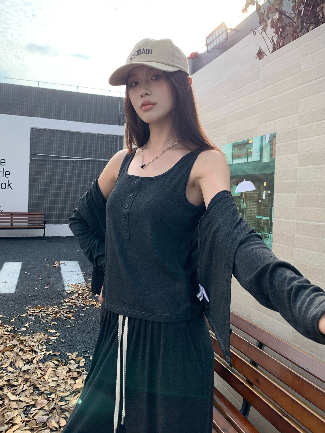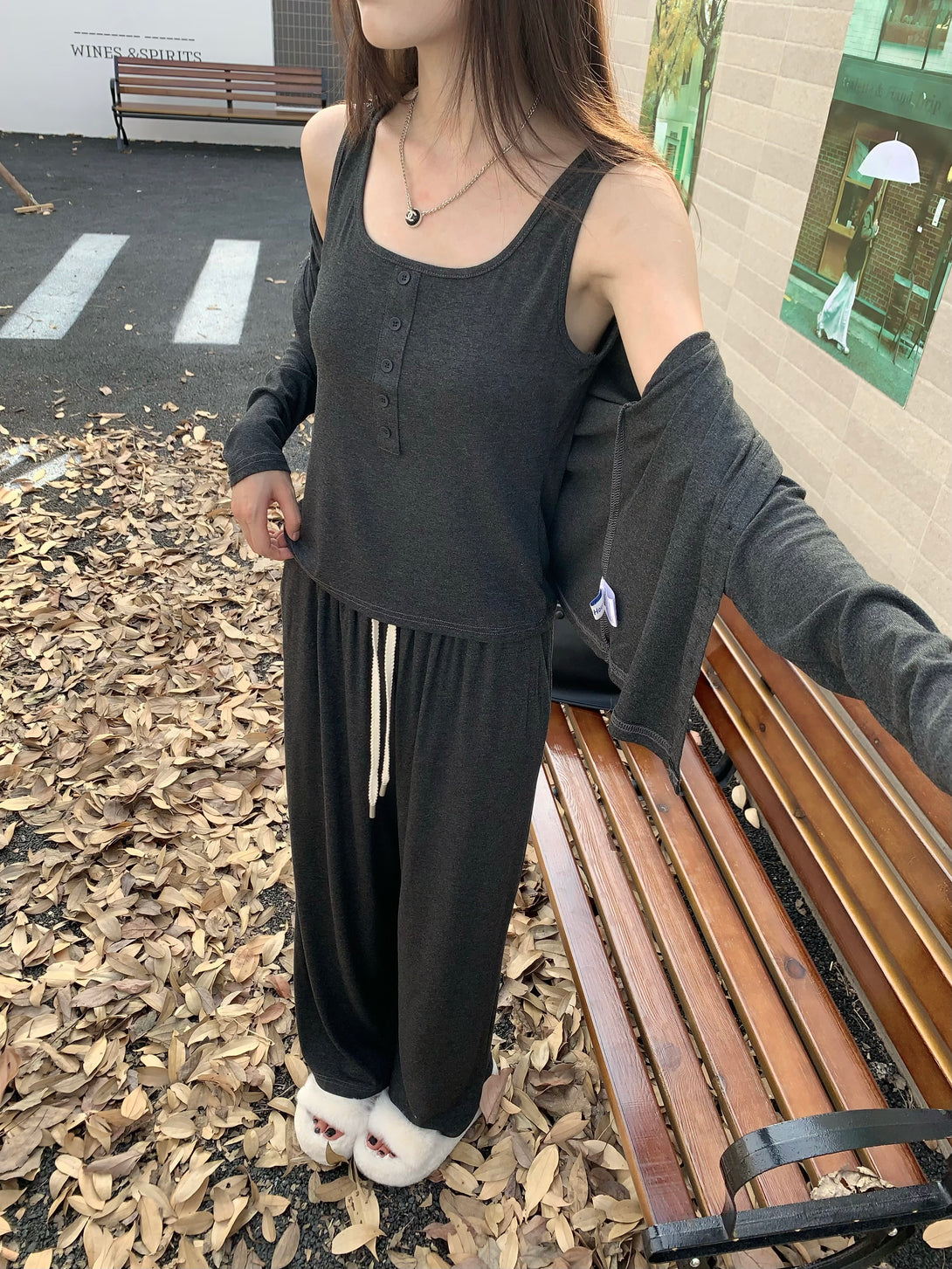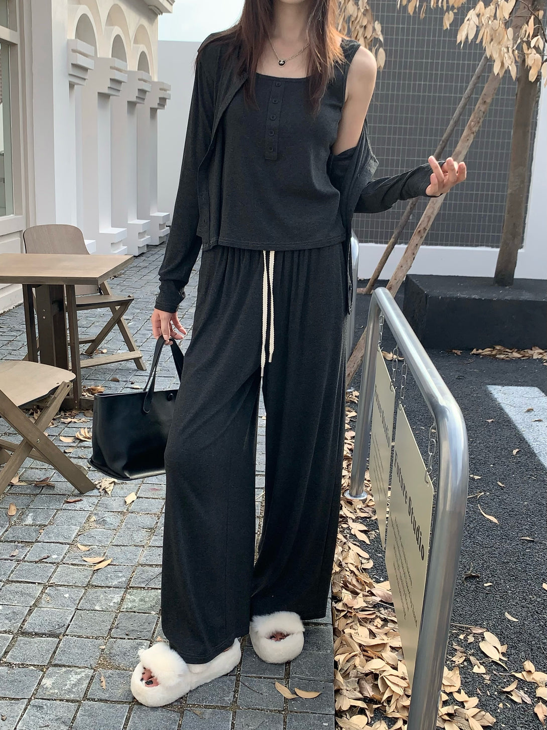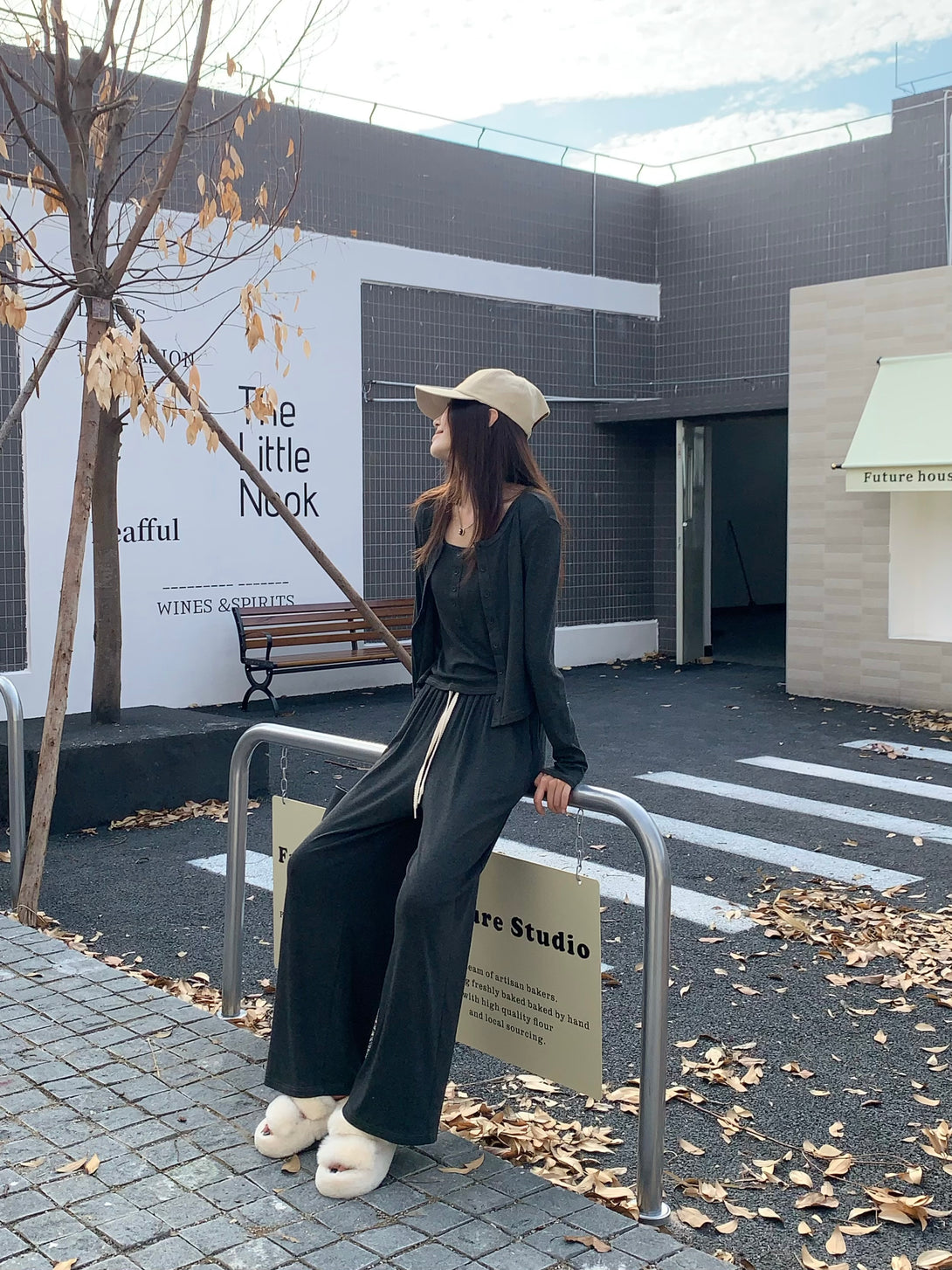 这套深灰色套装真的太省心啦!随便一穿就很好看,软软的面料穿起来超舒服,休闲阔腿裤的走起路来还有风~最喜欢这种不费力又有点小帅气的感觉了!