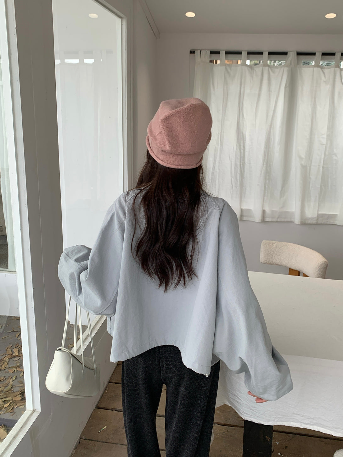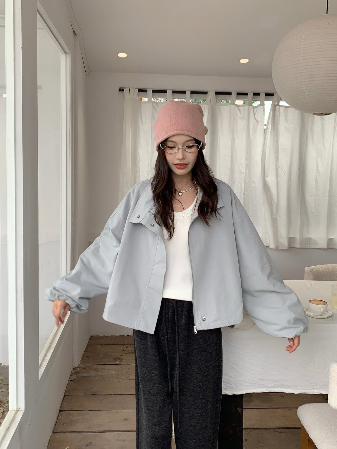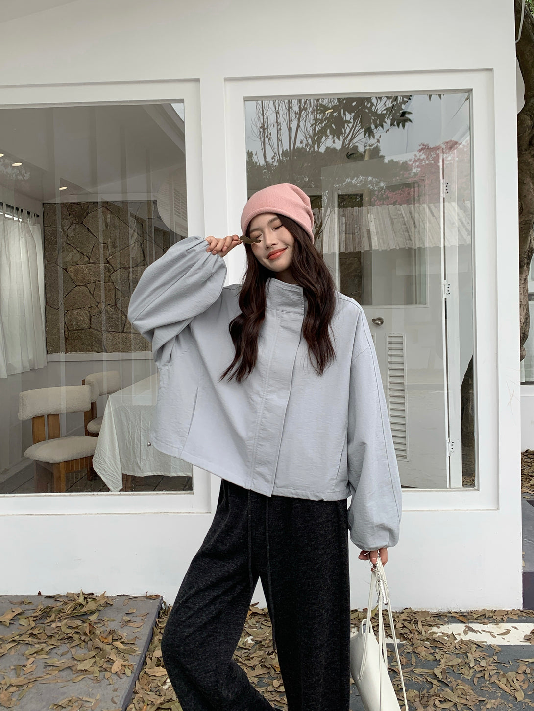 This light gray jacket is the perfect mix of simplicity and elegance~ Its slightly oversized fit gives off a relaxed, effortless vibe, while the lightweight fabric keeps it structured and stylish. Whether paired with dark trousers or a skirt, it brings out that soft-but-cool charm!