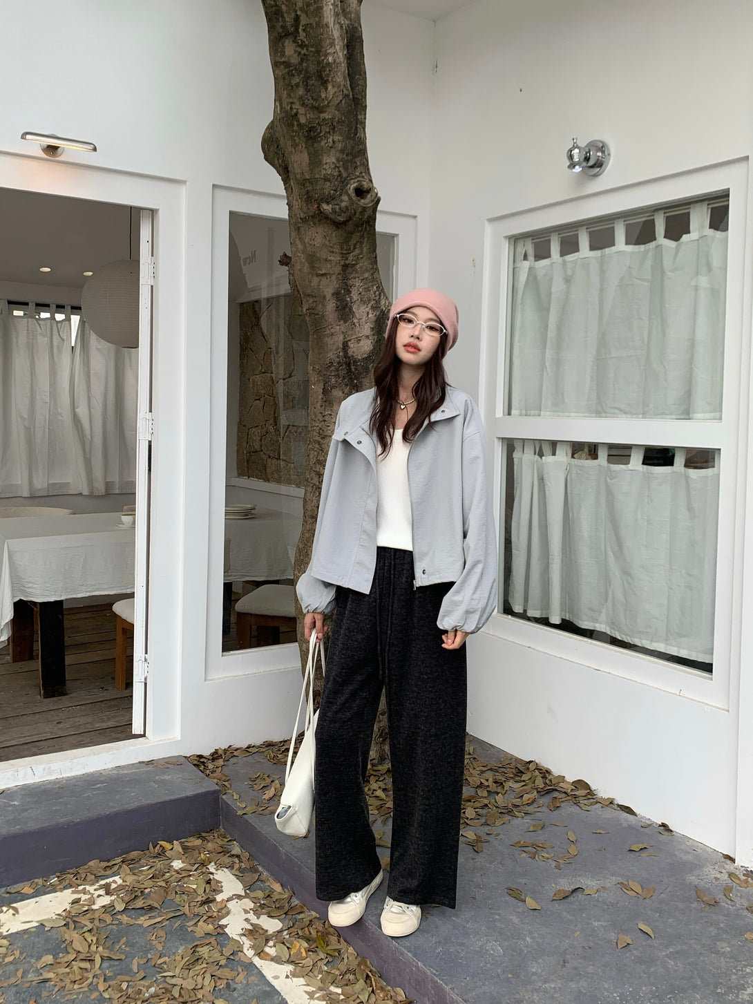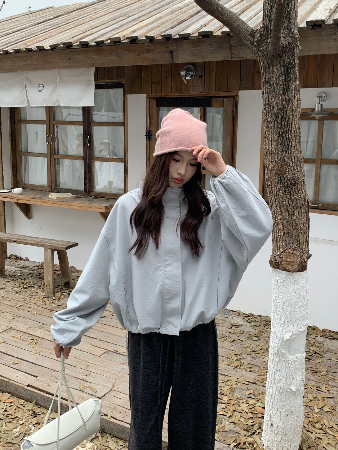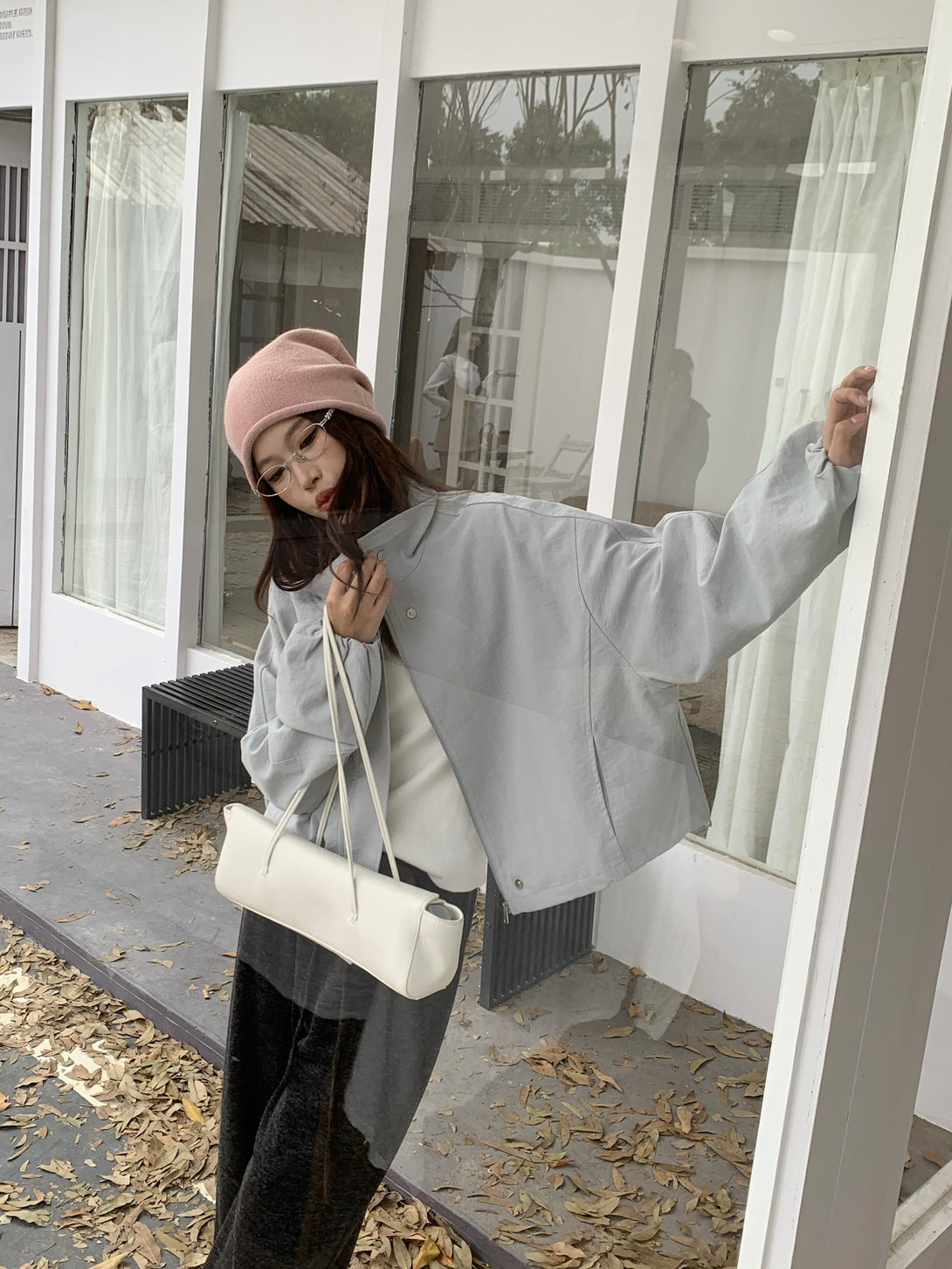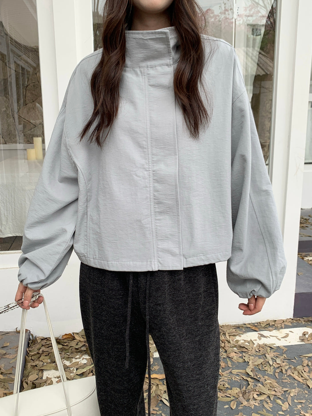 This light gray jacket is the perfect mix of simplicity and elegance~ Its slightly oversized fit gives off a relaxed, effortless vibe, while the lightweight fabric keeps it structured and stylish. Whether paired with dark trousers or a skirt, it brings out that soft-but-cool charm!