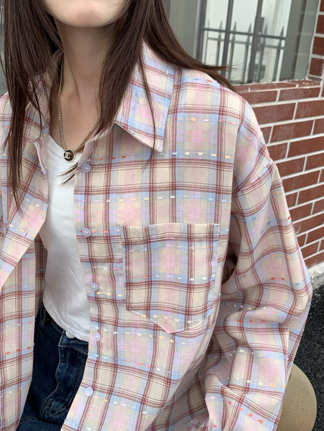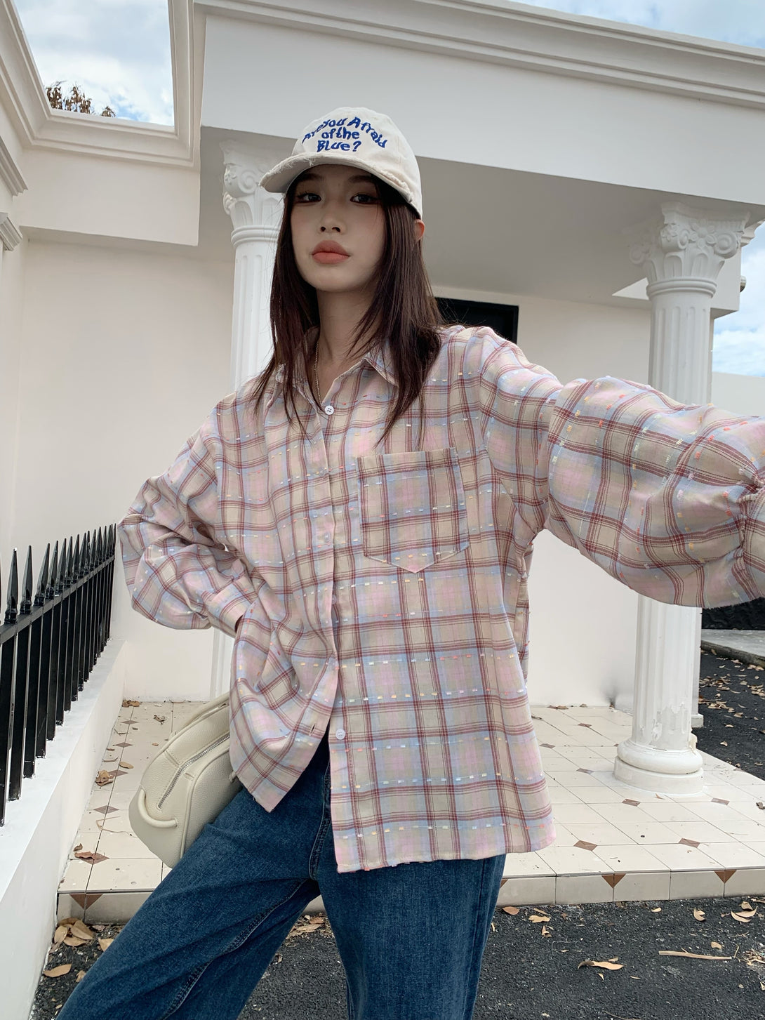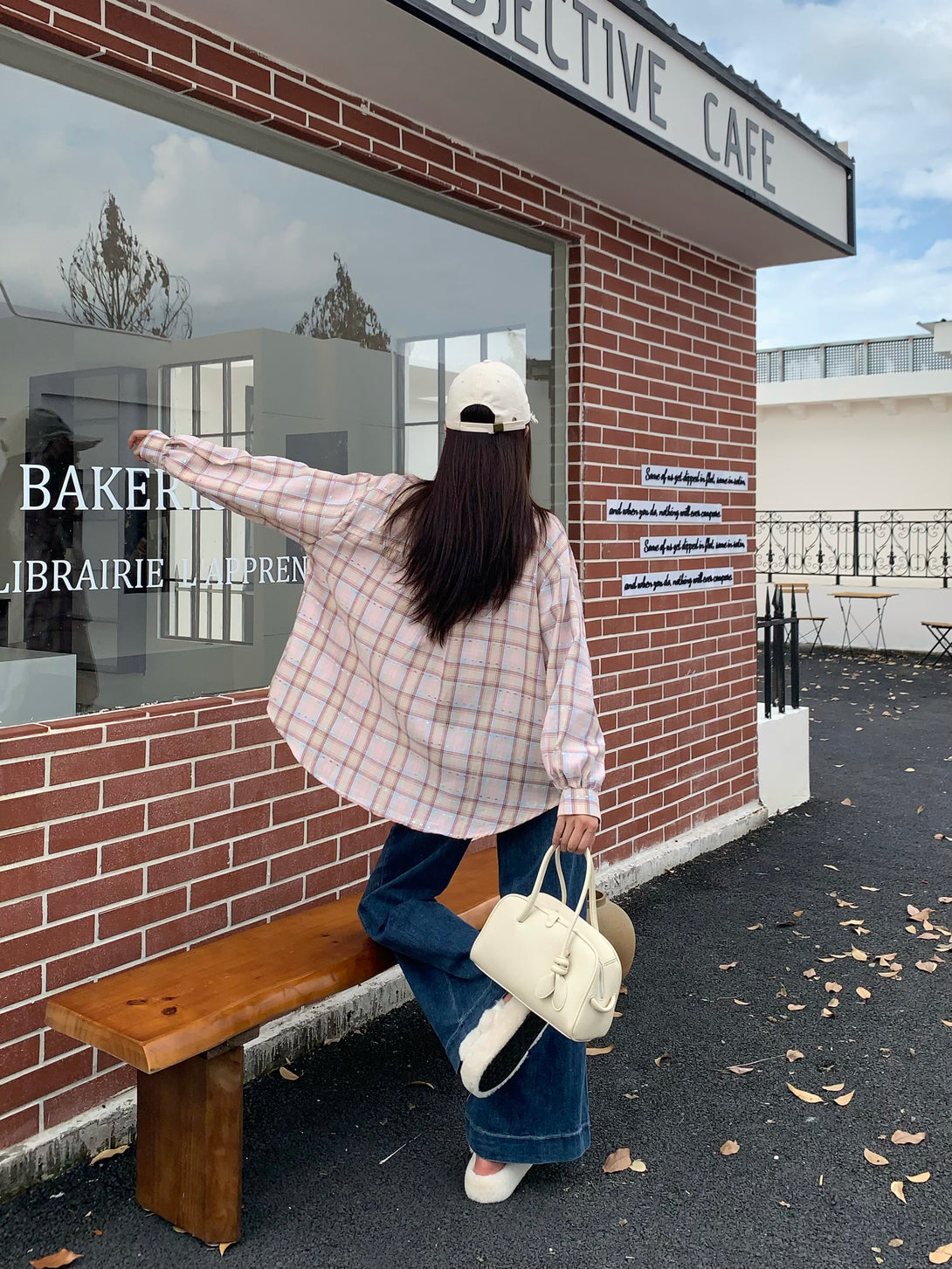 This plaid shirt has a soft and gentle vibe, with light pink tones woven into the checks for a fresh and casual look. Its slightly oversized fit adds a touch of laid-back comfort, making everyday styling easy and relaxed. The subtle shimmer catches the light, understated yet unique. Whether worn alone or layered, it brings out a playful and cute charm.