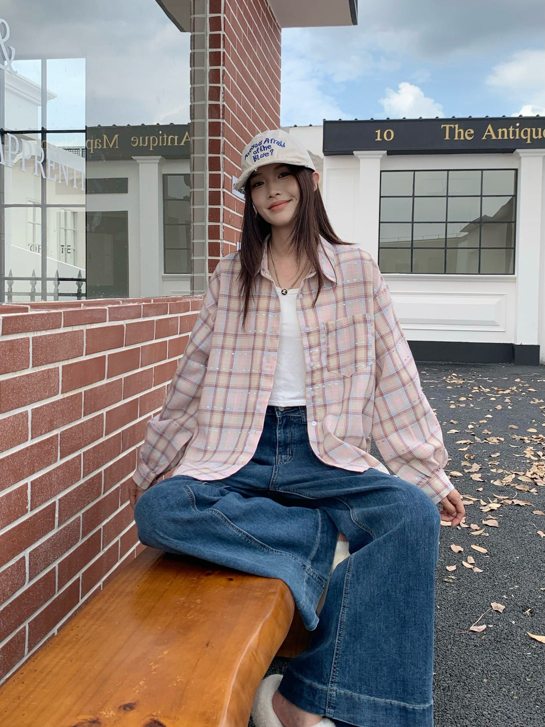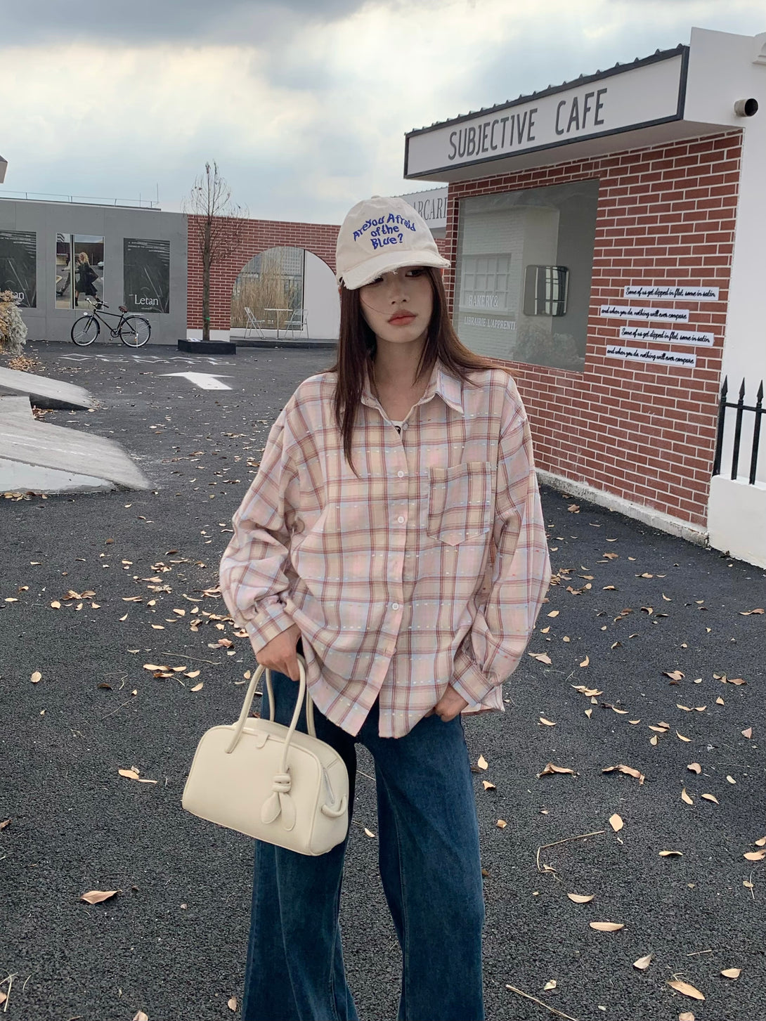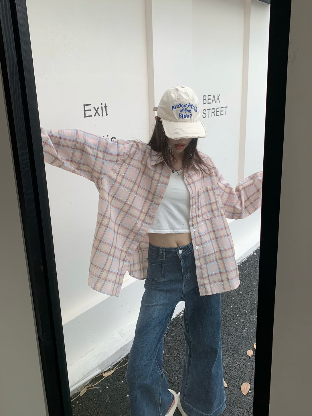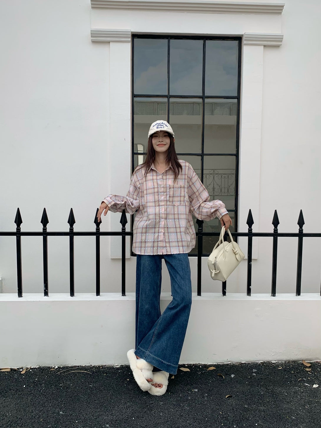 This plaid shirt has a soft and gentle vibe, with light pink tones woven into the checks for a fresh and casual look. Its slightly oversized fit adds a touch of laid-back comfort, making everyday styling easy and relaxed. The subtle shimmer catches the light, understated yet unique. Whether worn alone or layered, it brings out a playful and cute charm.