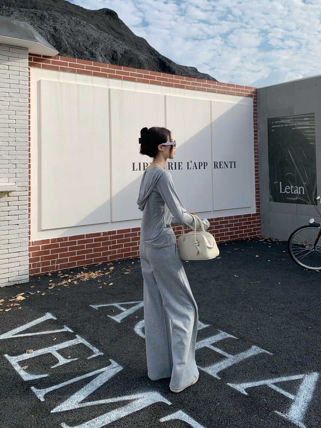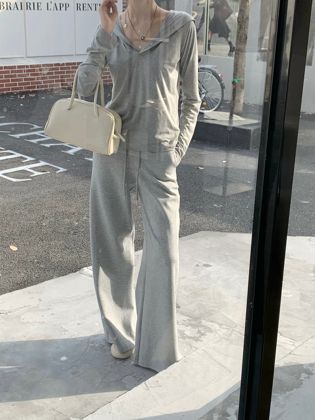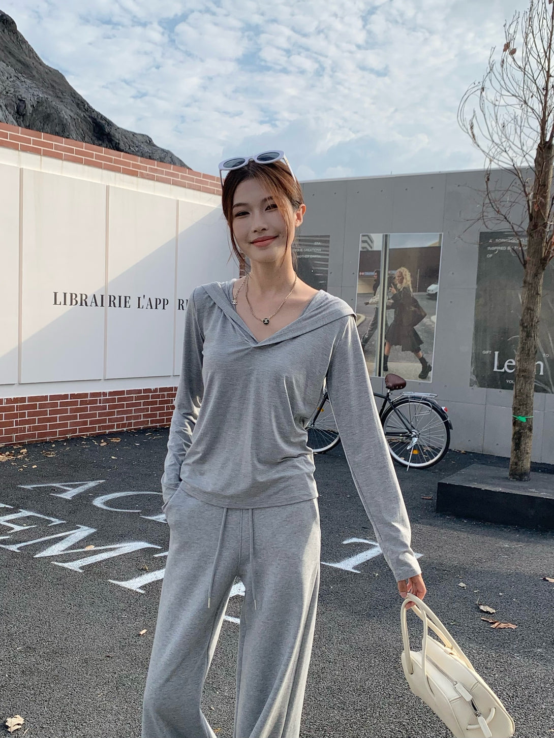这件灰色上衣真的好慵懒好舒服呀~轻薄的面料随便一穿就很自在。小V领加上连帽设计,带点随性的运动感,却又不会显得太随便。搭配同色系休闲裤,整套看起来超有氛围感,低调又时髦。穿上它,就像随时可以去散步喝咖啡的小确幸日常。