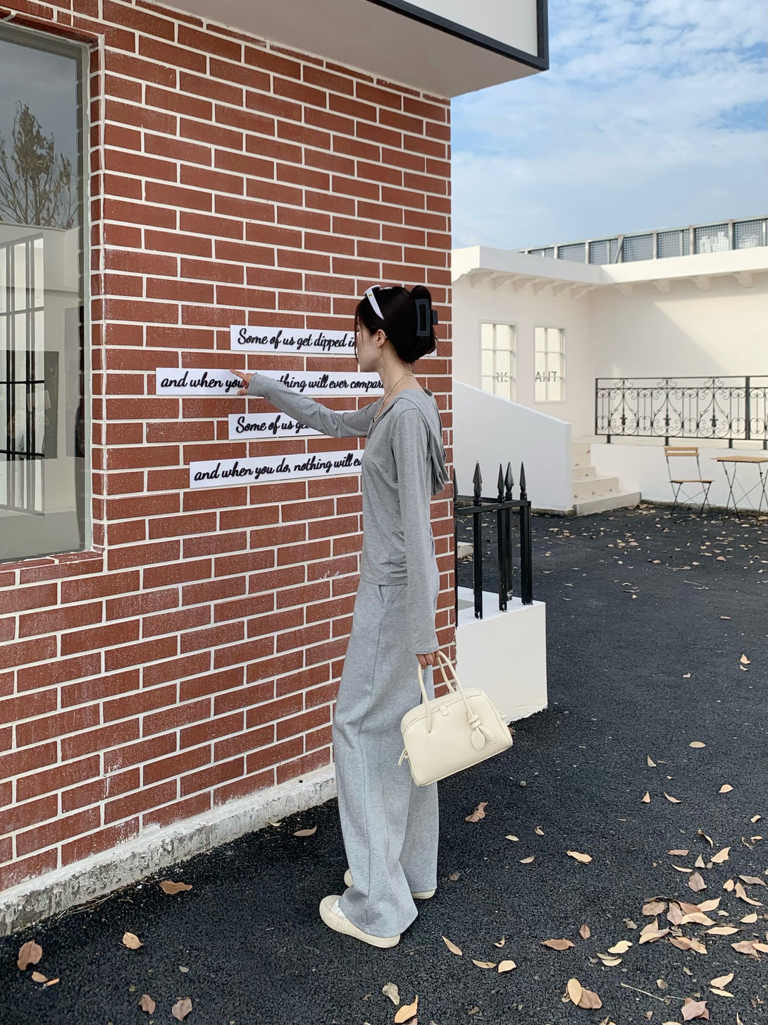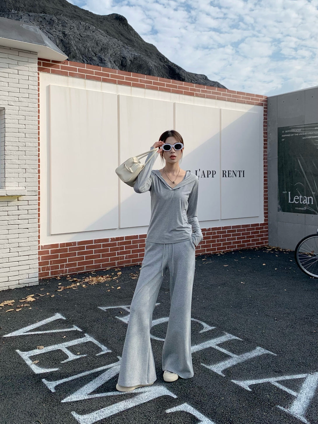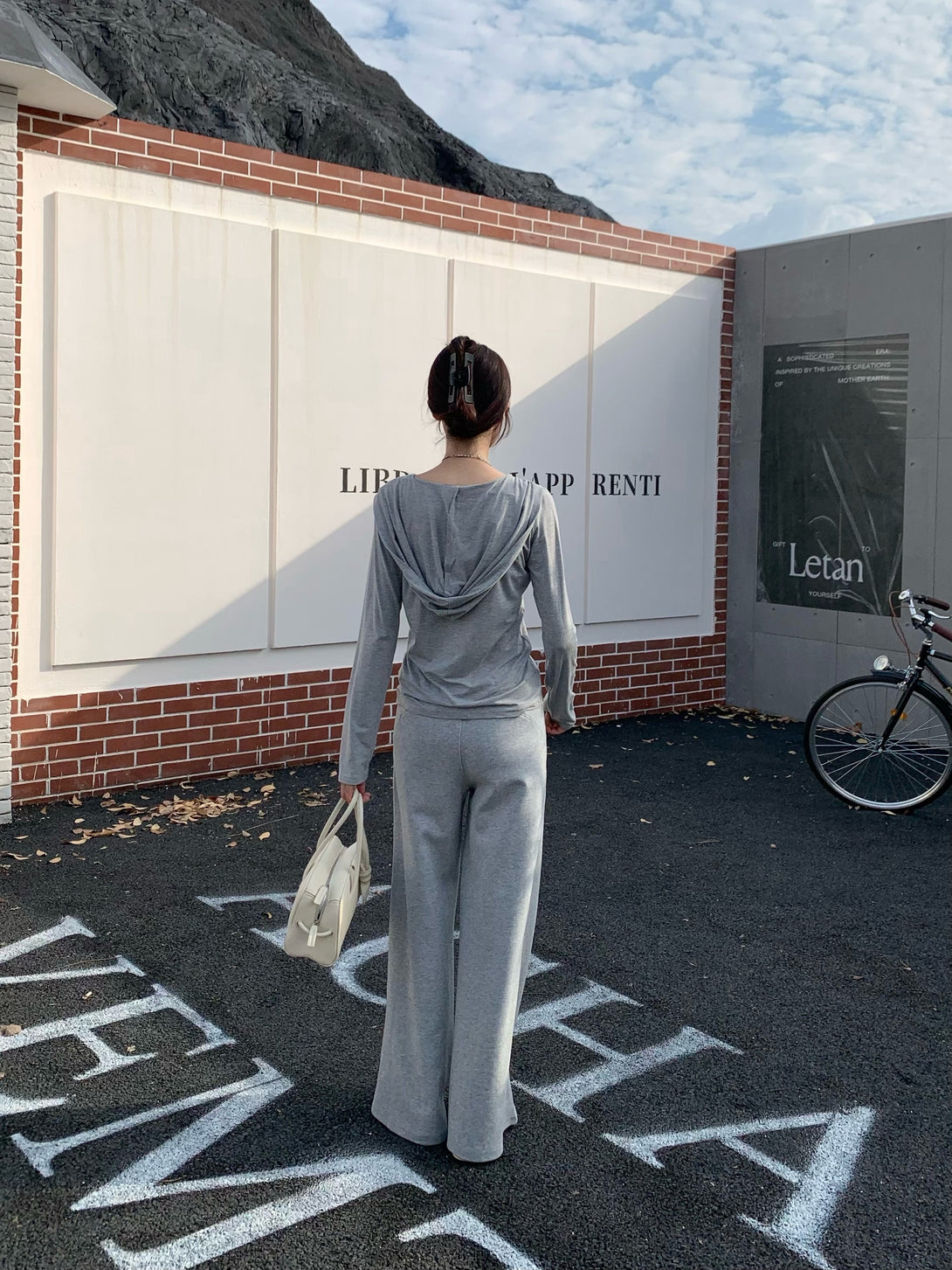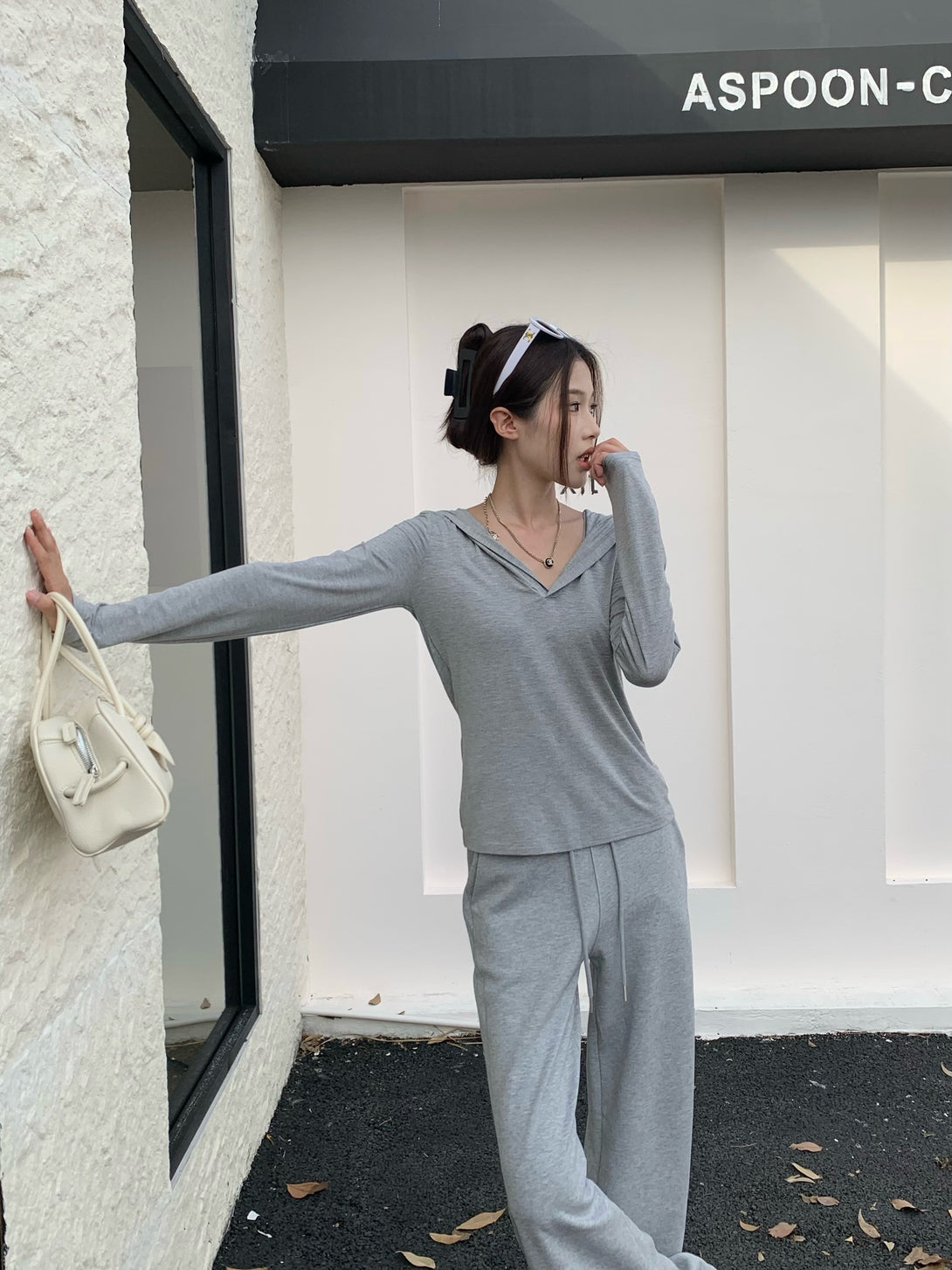 This grey hoodie-style top is just so cozy and laid-back! The lightweight fabric makes it effortless to wear. The little V-neck with the hood gives it a casual sporty vibe without being sloppy. Paired with matching joggers, it looks super stylish in a subtle way. Wearing it feels like being ready for a coffee walk anytime.