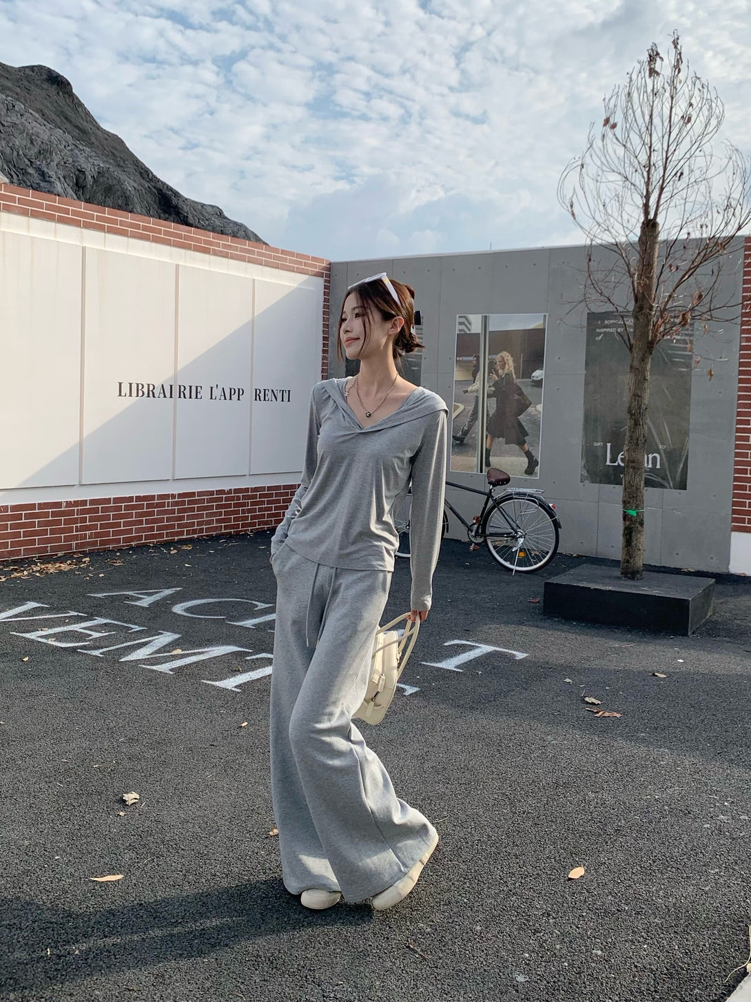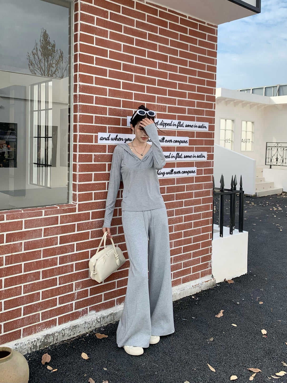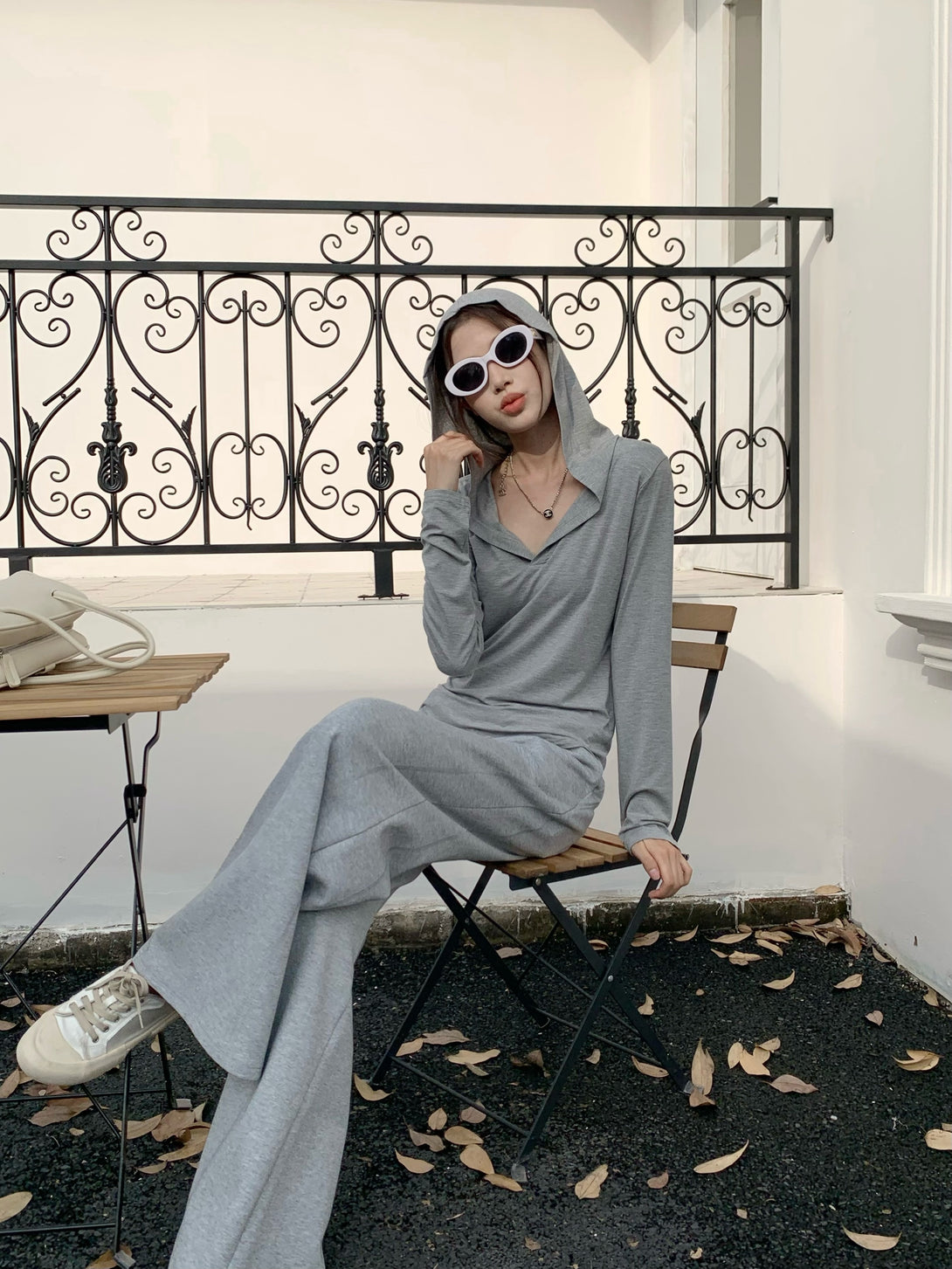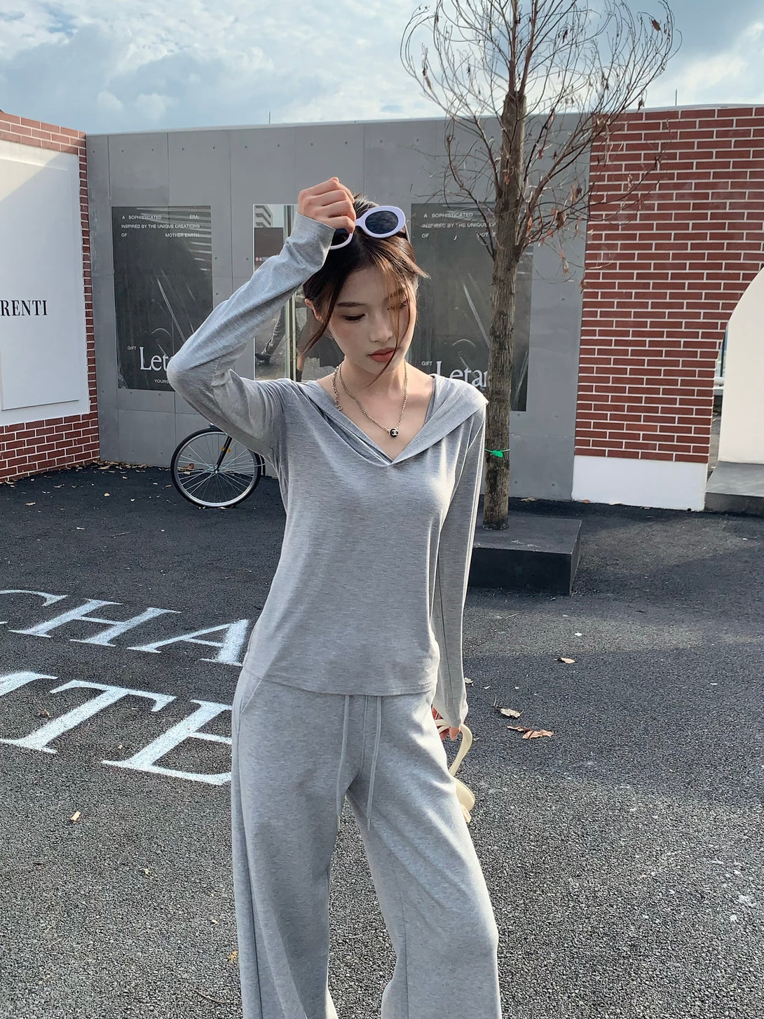 This grey hoodie-style top is just so cozy and laid-back! The lightweight fabric makes it effortless to wear. The little V-neck with the hood gives it a casual sporty vibe without being sloppy. Paired with matching joggers, it looks super stylish in a subtle way. Wearing it feels like being ready for a coffee walk anytime.